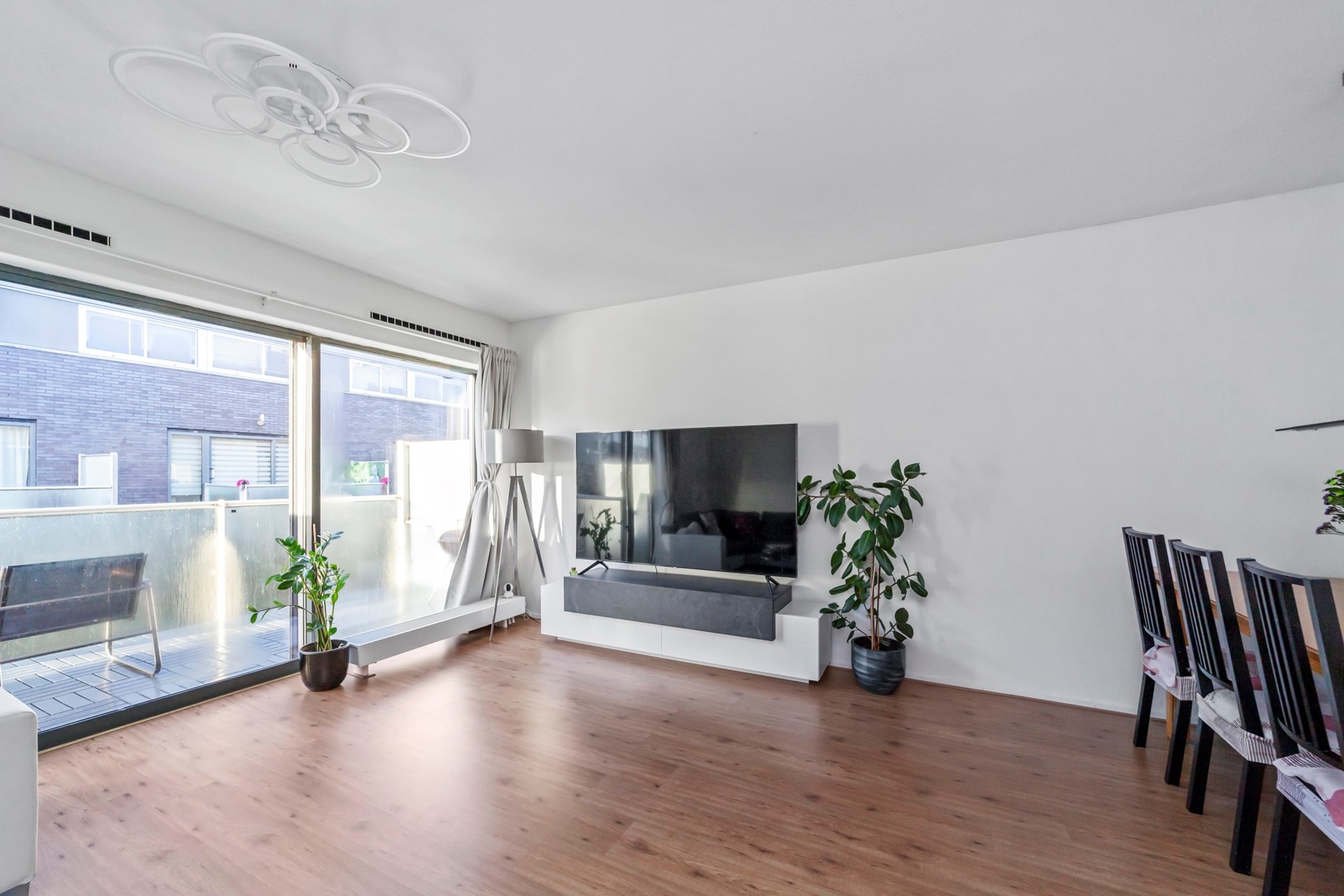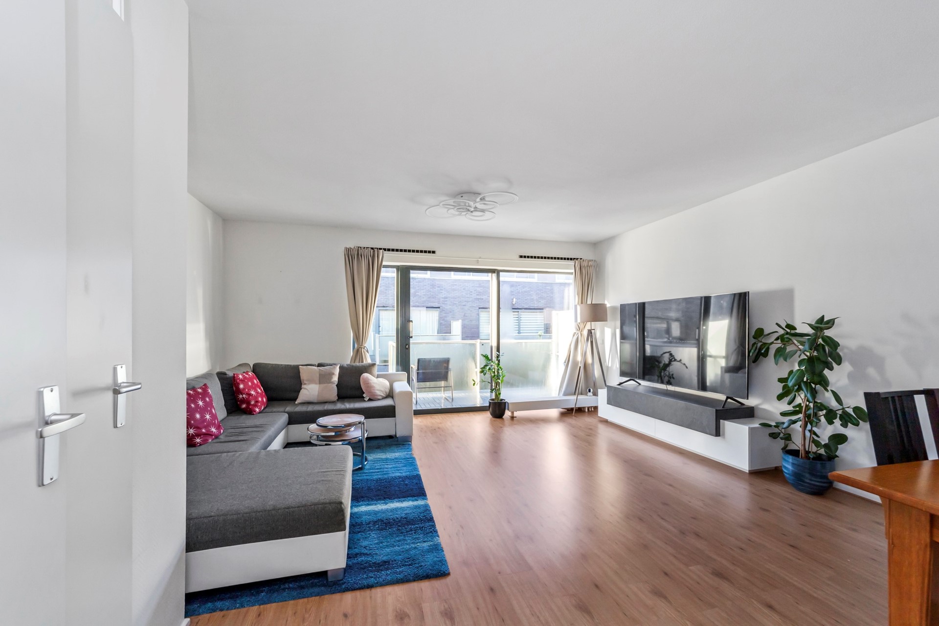 Toegang tot de zeer lichte en gezellig ingedeelde woon-/eetkamer met vaste kast en grote schuifpui naar het zonnige balkon met fraai zicht over het water.