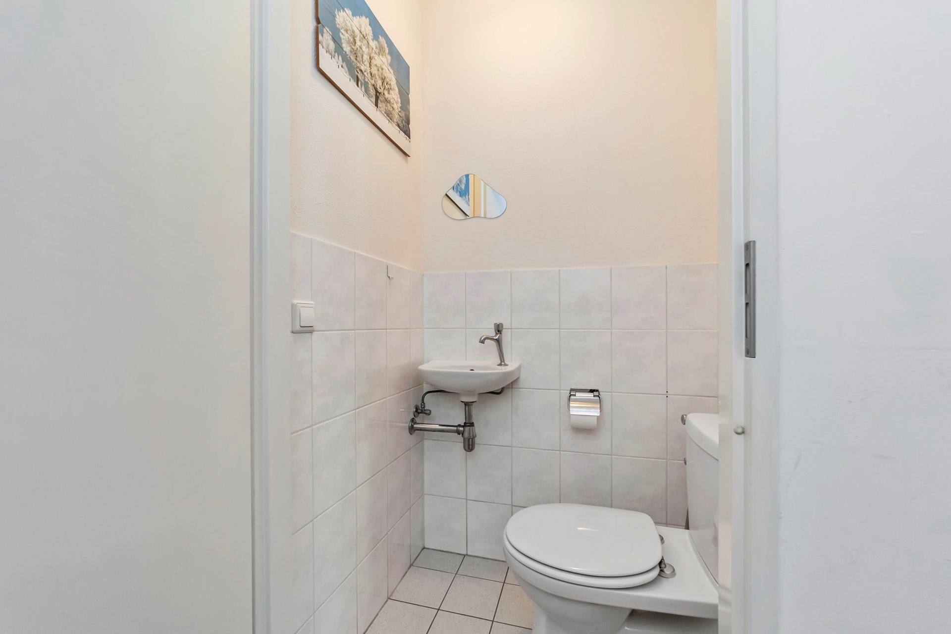 Entrance: Spacious hall with the meter cupboard, a modern, half-tiled toilet with a small sink, and stairs to the first floor.