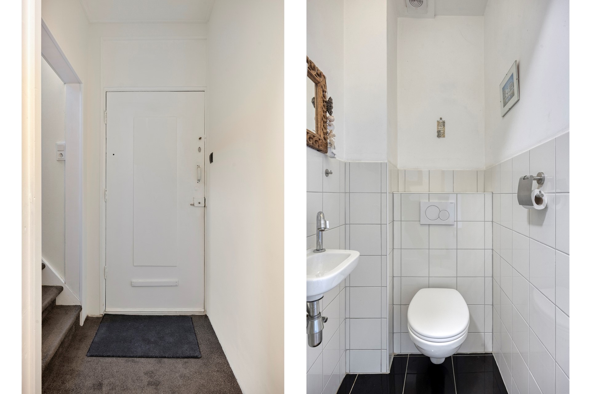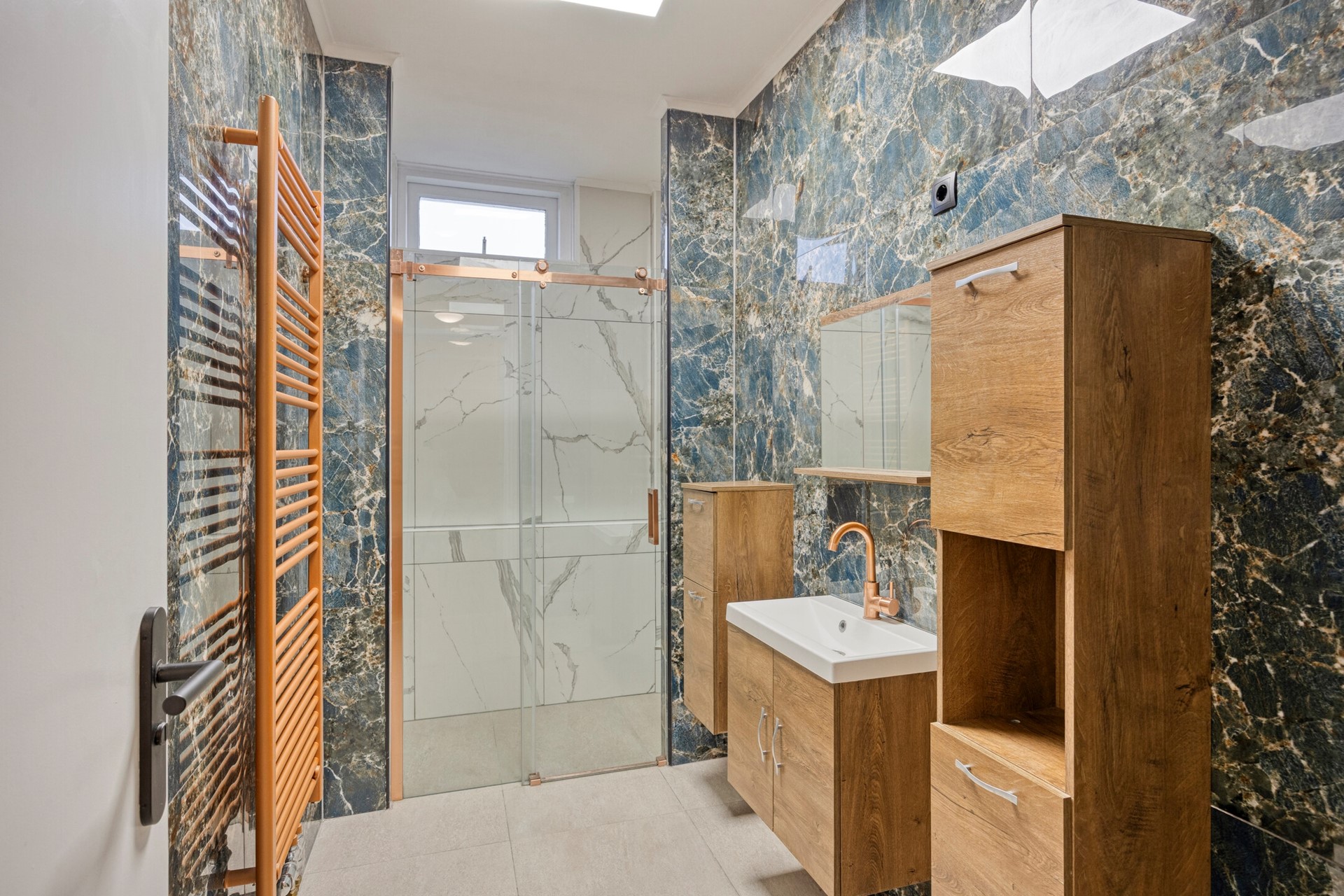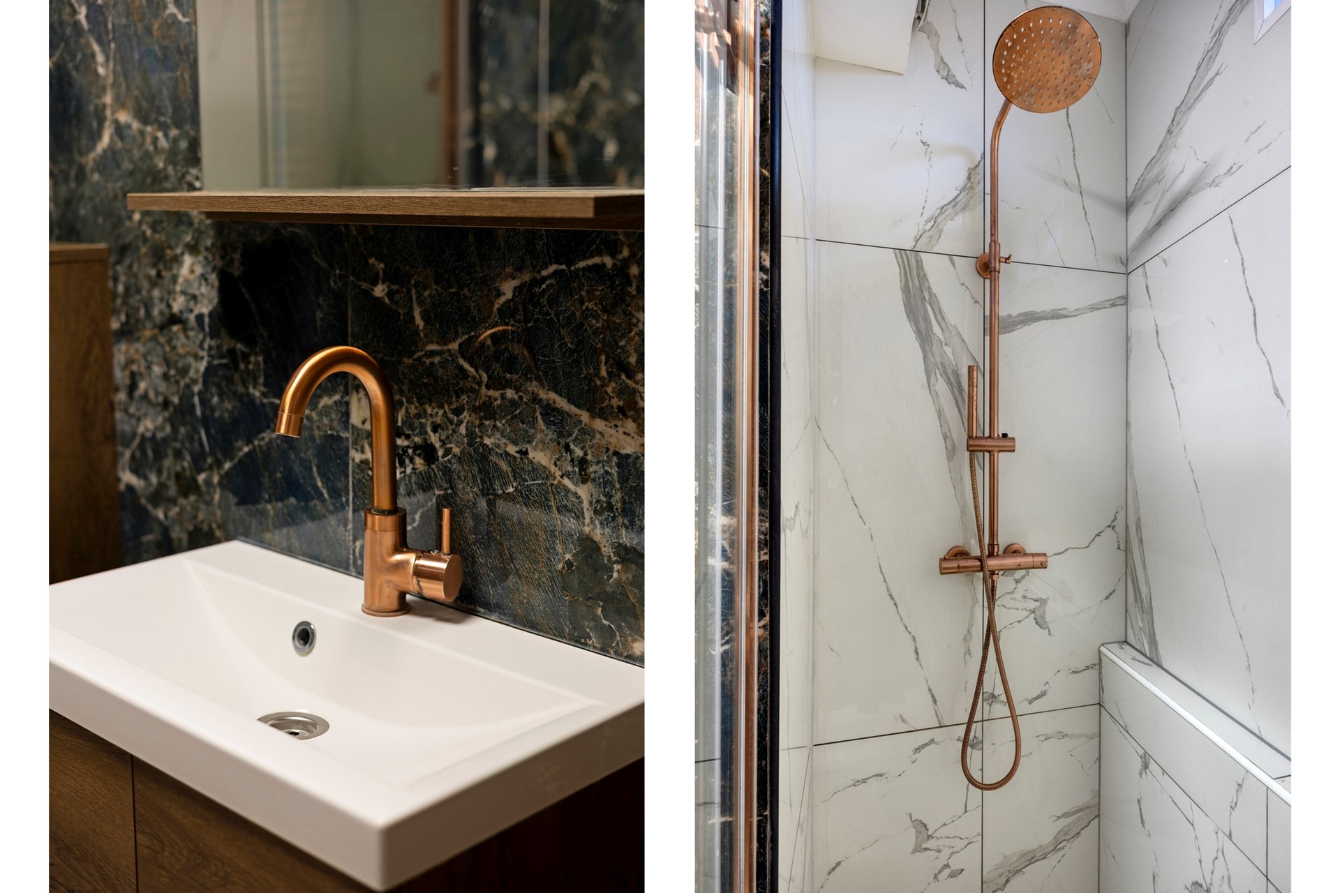 Op de eerste woonlaag bevindt zich een moderne badkamer, afgewerkt met marmerlook tegels en bronskleurige kranen. Op de tweede woonlaag zijn een tweede badkamer én een extra toilet gesitueerd