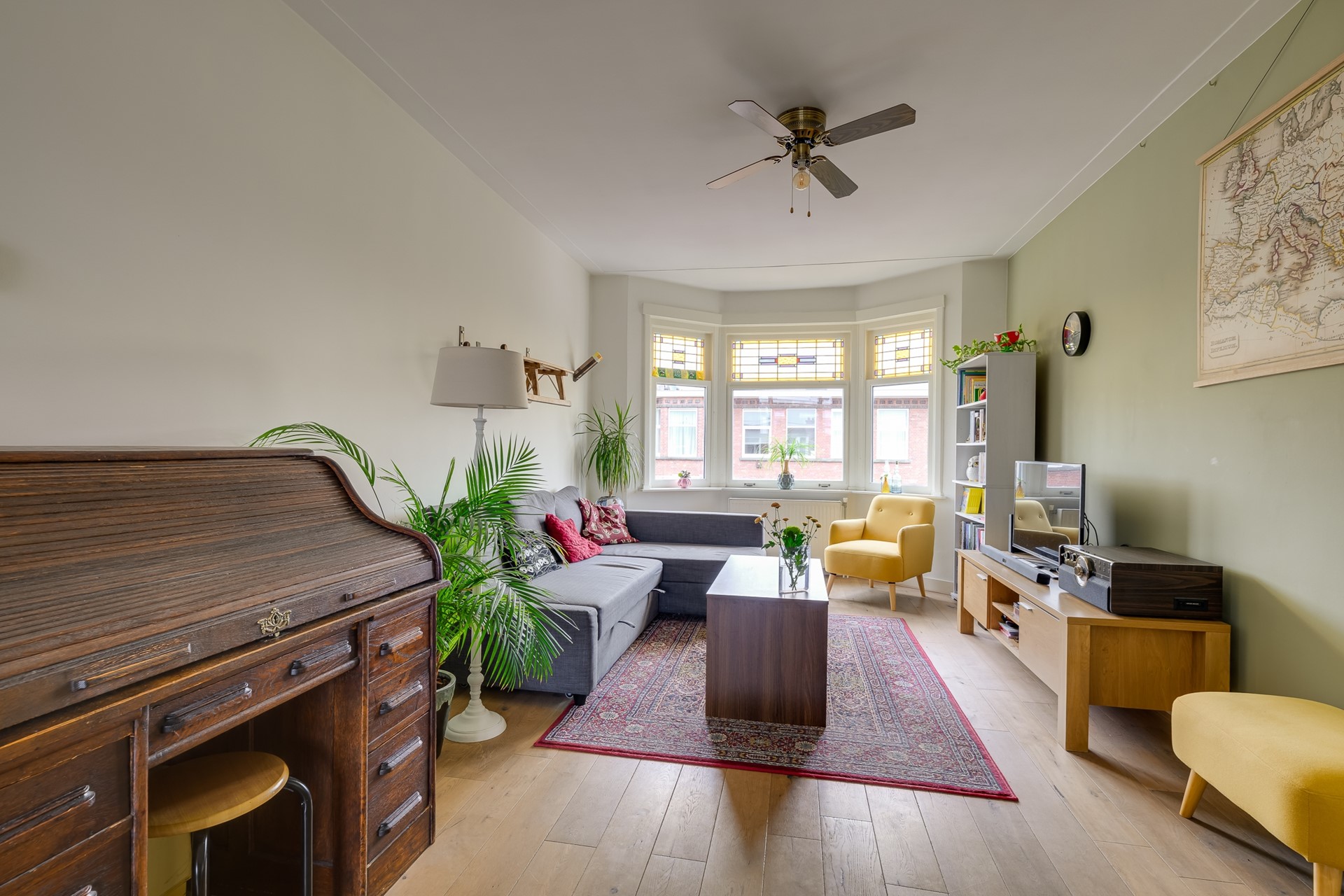 Dit appartement voelt direct goed zodra je binnenkomt. De eigen trap brengt je naar de bovenste woonlaag, waar je wordt verwelkomd door een zee van licht. De royale woonkamer (ca. 10,7 x 3,4 m) strekt zich uit met een sfeervolle erker aan de voorzijde, compleet met originele glas-in-lood bovenlichten. Het geeft een charmant vleugje historie dat mooi contrasteert met de strakke, moderne afwerking.