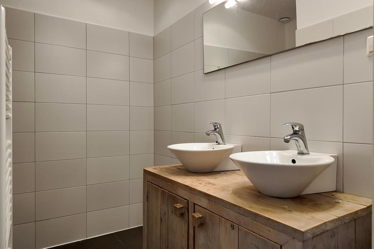 De moderne badkamer maakt het geheel af: een efficiënte indeling met een inloopdouche en een stijlvol dubbel wastafelmeubel. Hier fris je je elke ochtend moeiteloos op, terwijl het frisse tegelwerk een moderne en luxe uitstraling geeft.
