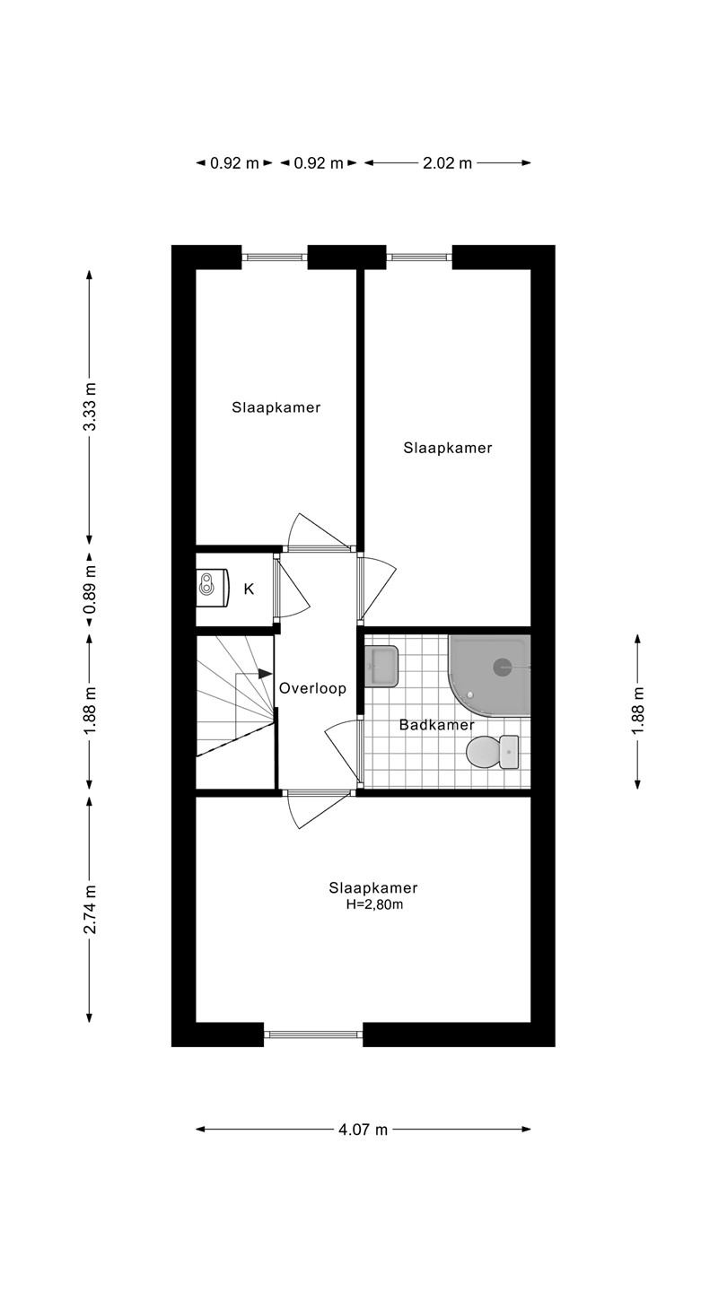 De badkamer is in het midden tussen de slaapkamers geplaatst.