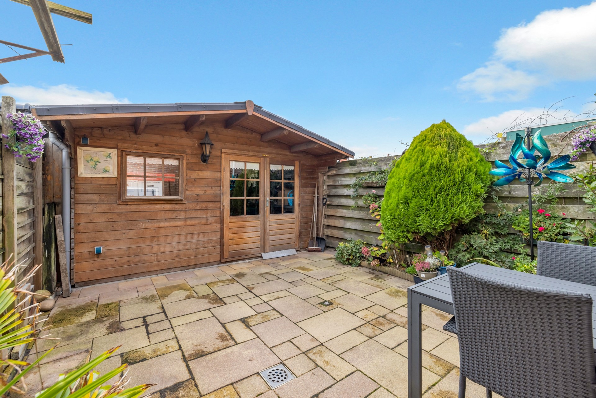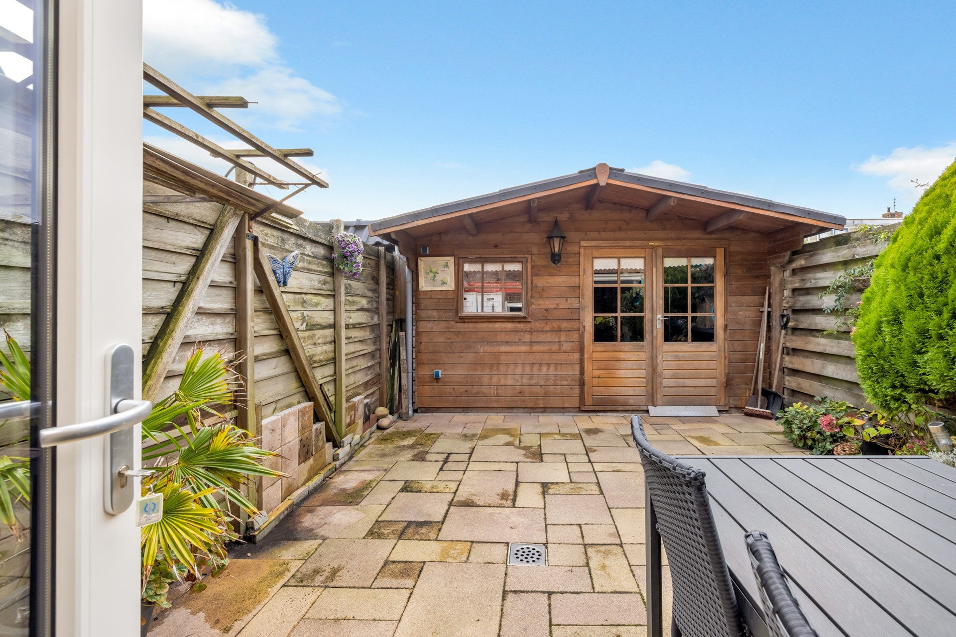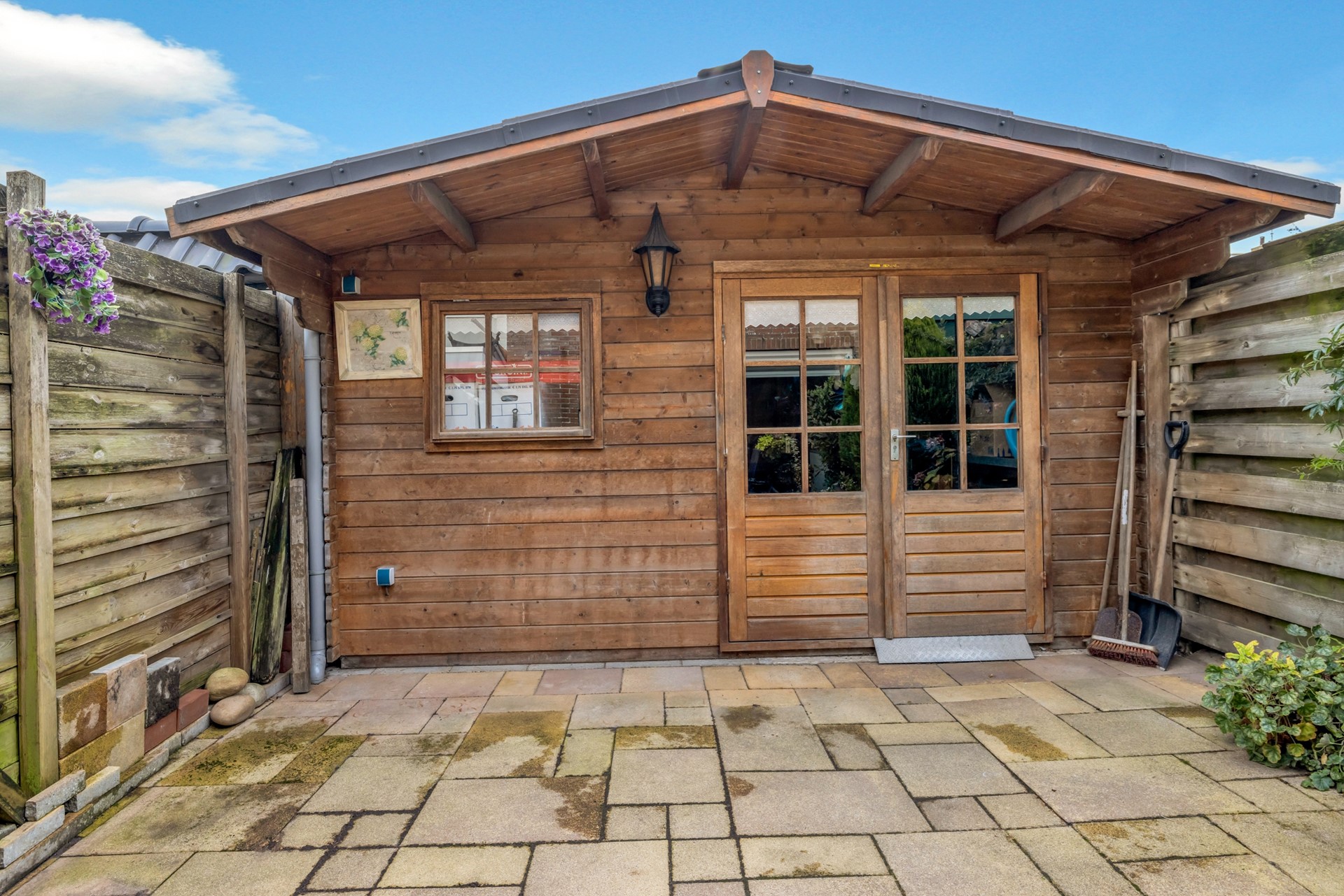 Vanuit de woonkamer kan je de ruime achtertuin inlopen. Deze is voorzien van een groot chalet die als schuur dienst doet.