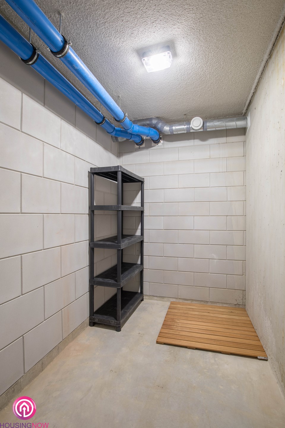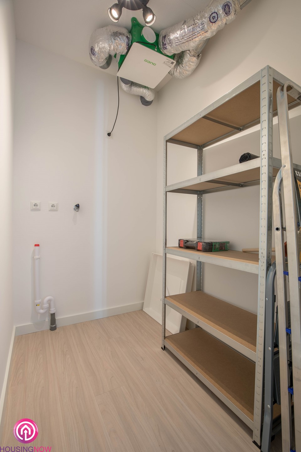 Ruime inpandige berging met ventilatie unit en aansluiting voor wasmachine en droger.