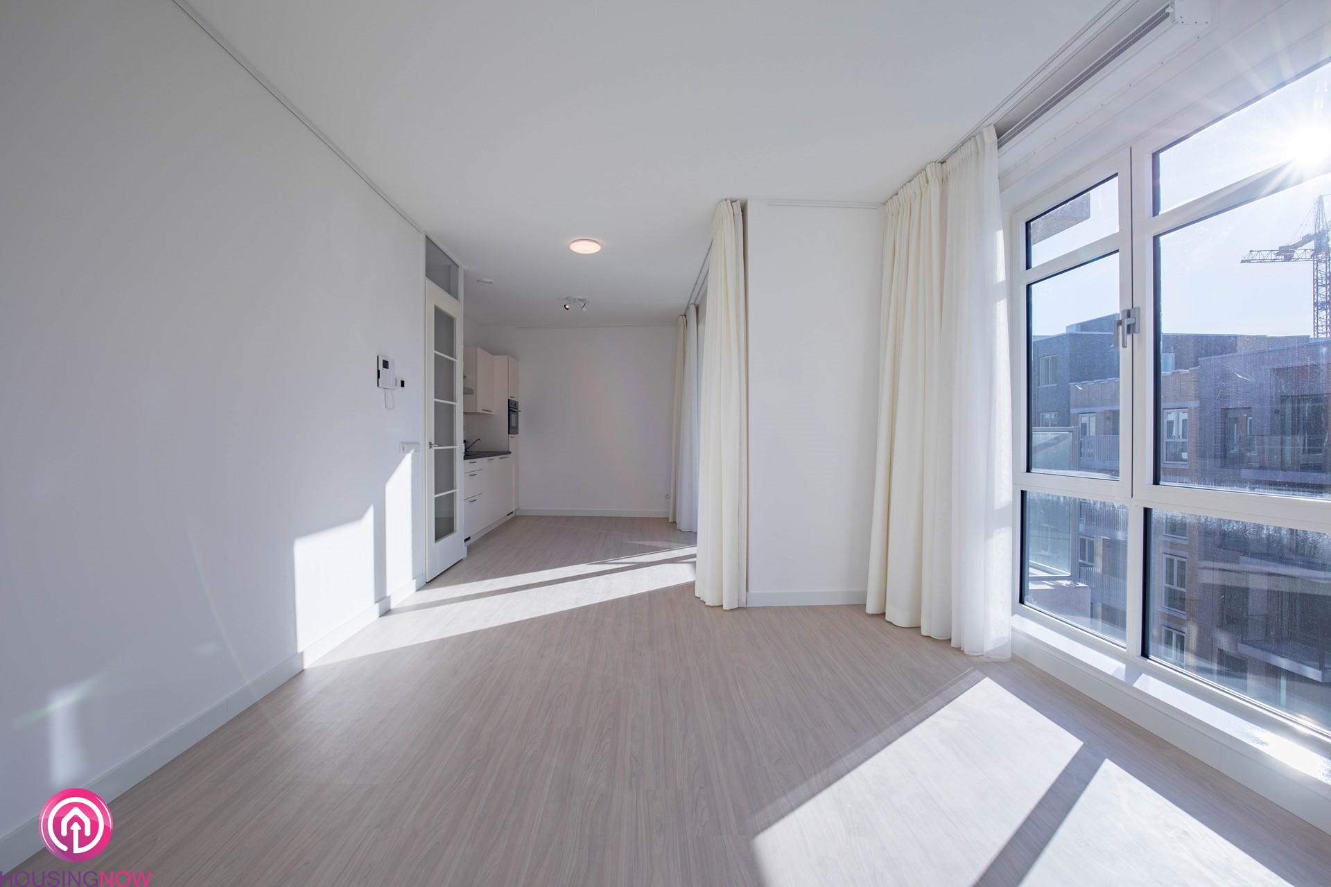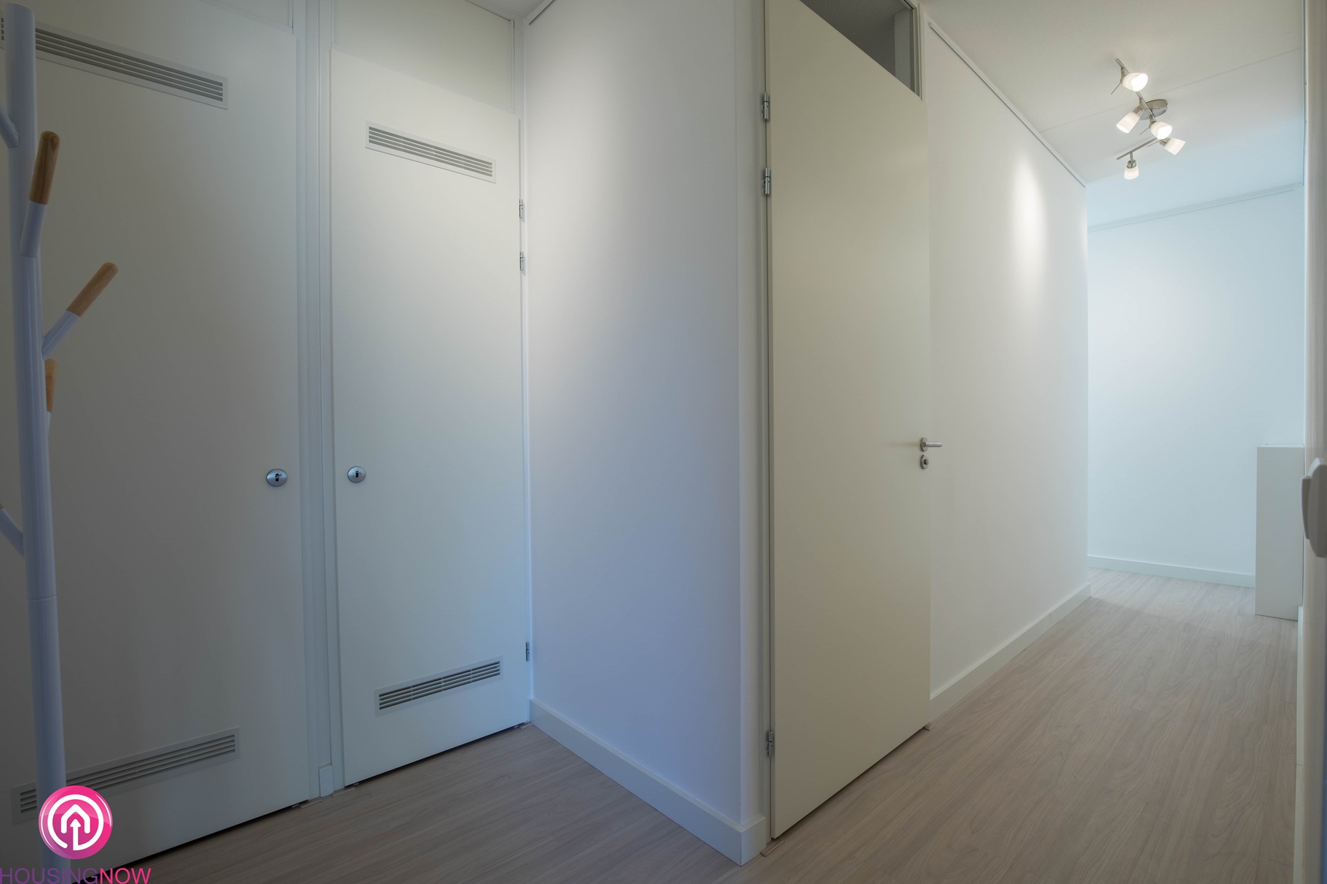 In de gehele woning ligt doorlopend dezelfde lichte vloer. Alle muren zijn strak gestukt en wit geschilderd.