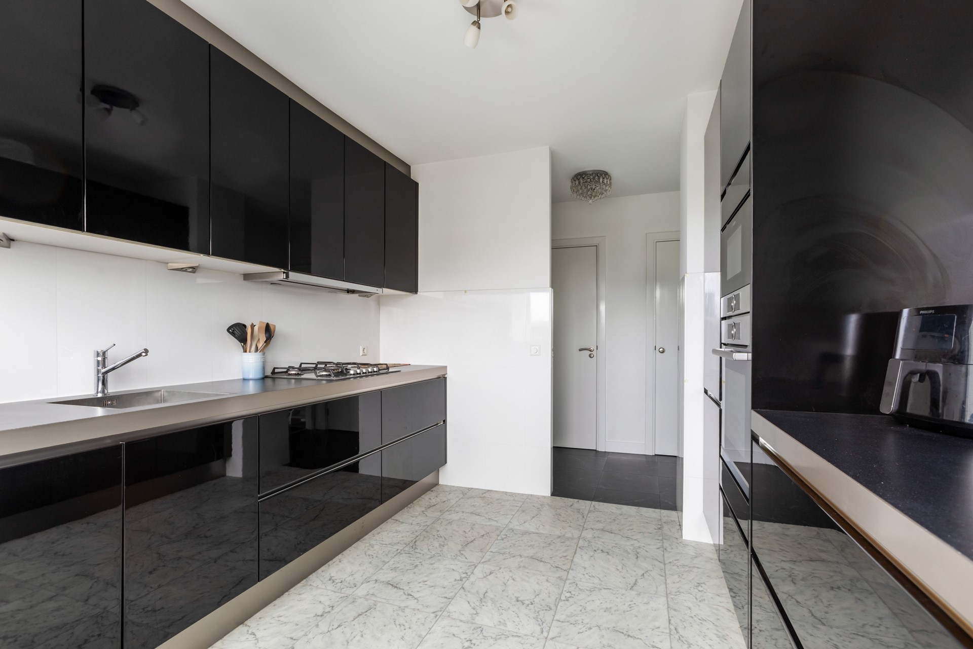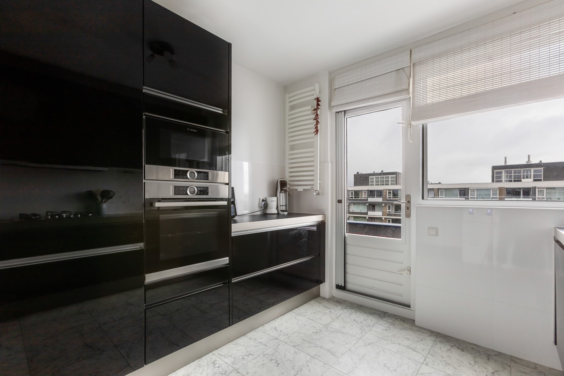 Entree in de hal: intercom, separaat (zwevend) toilet met fonteintje, grote garderobekast, meterkast en toegang tot de keuken welke voorzien is van alle denkbare inbouwapparatuur (magnetron, oven, vaatwasser, 5-pits gaskookplaat, - koelkast- net nieuw). Tevens voorzien van een kleine warmwaterboiler. Vanuit de keuken toegang tot het eerste balkon op het oosten. Zeer ruime en lichte woonkamer welke over de volle lengte van het appartement loopt.