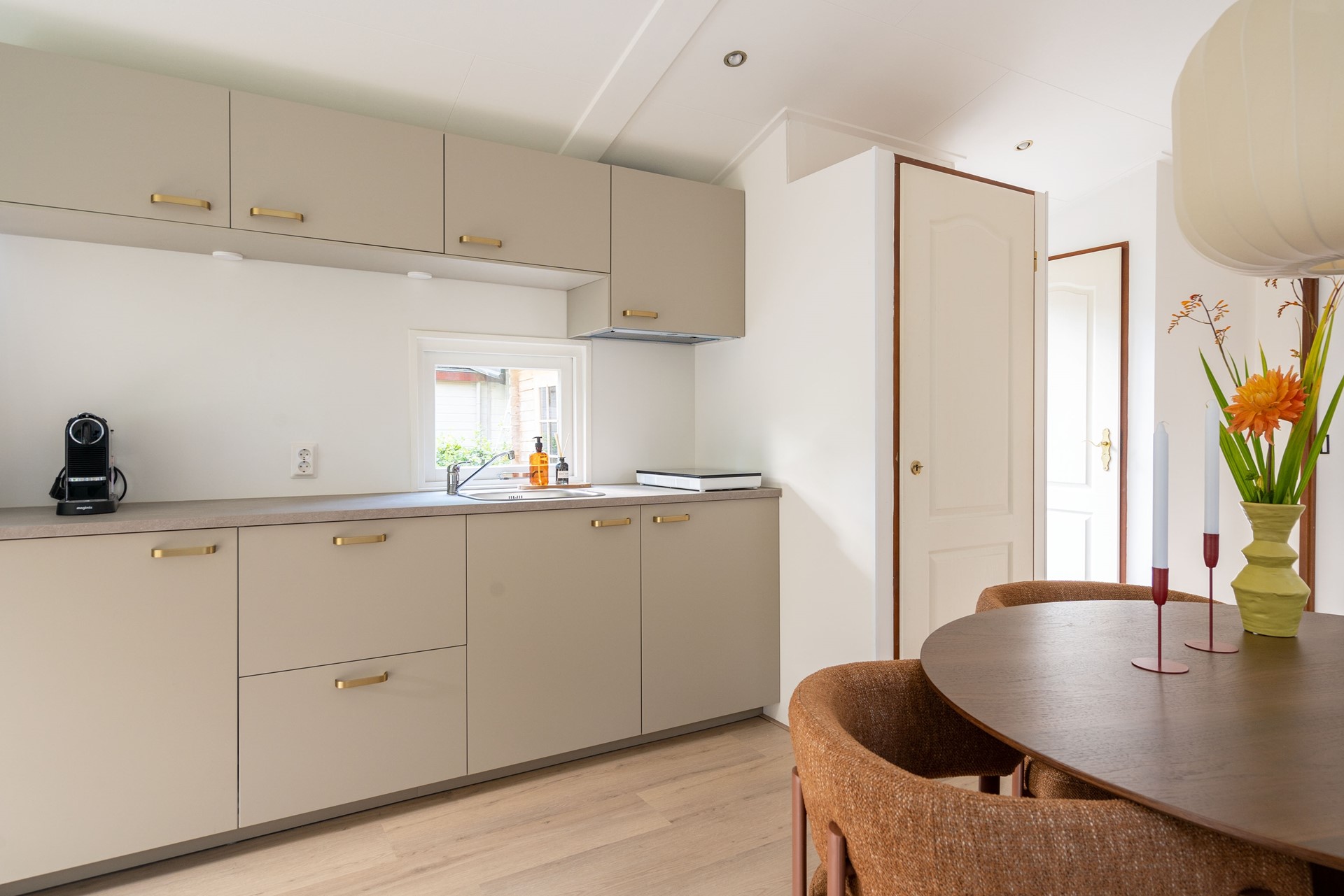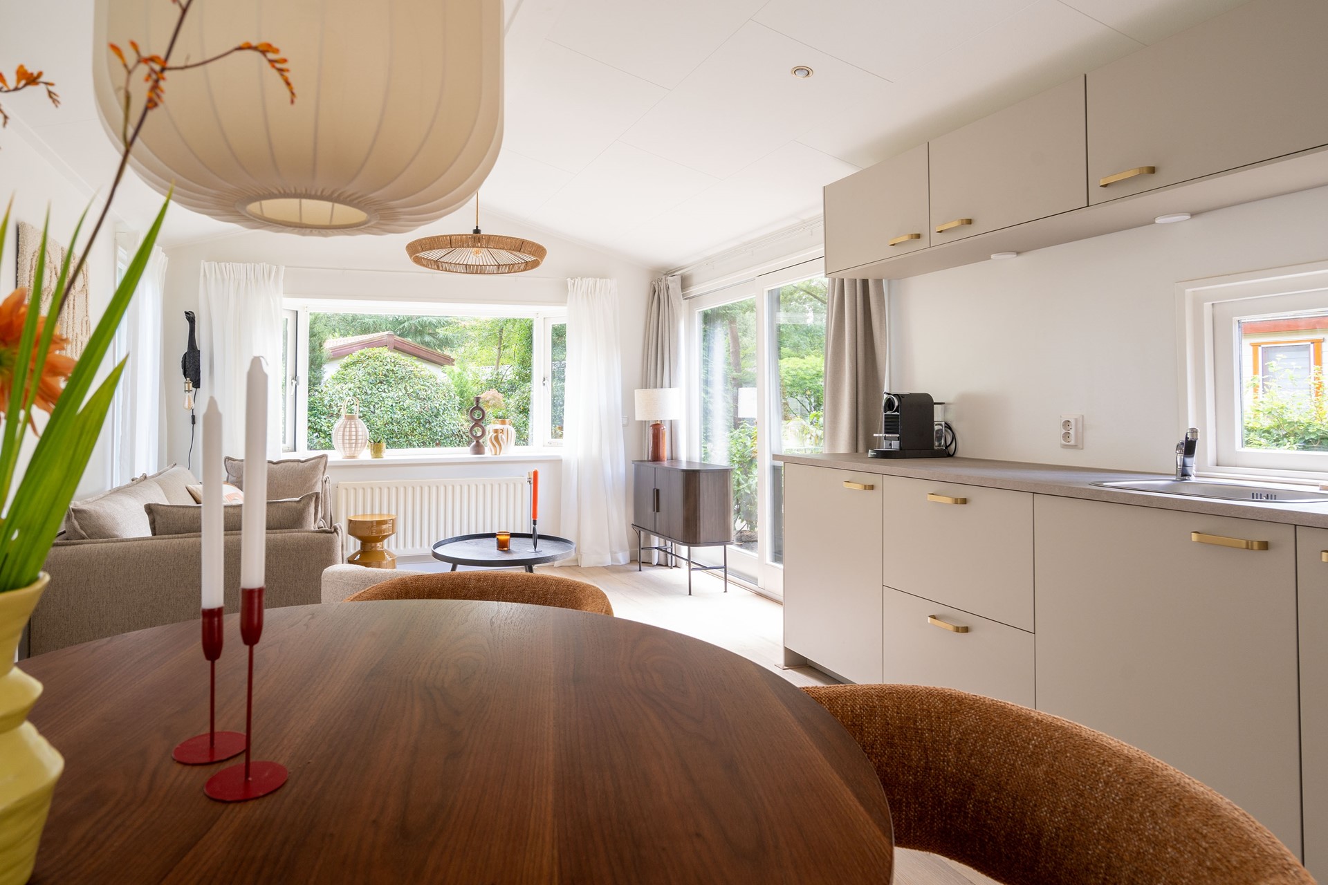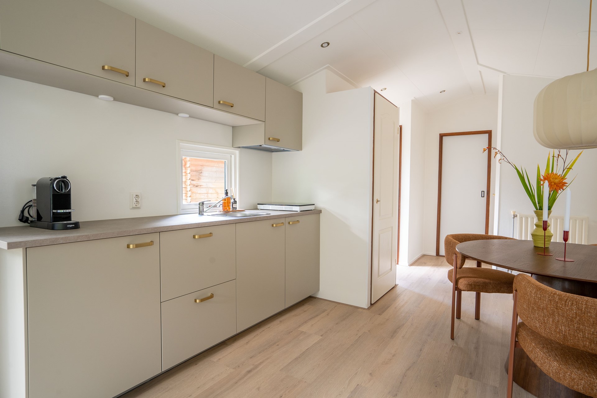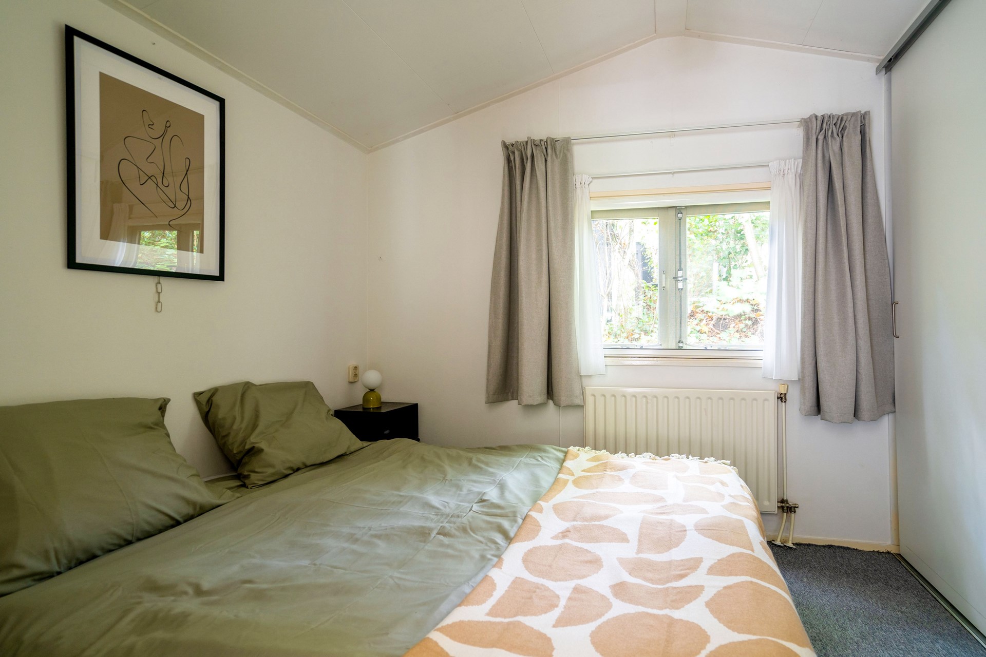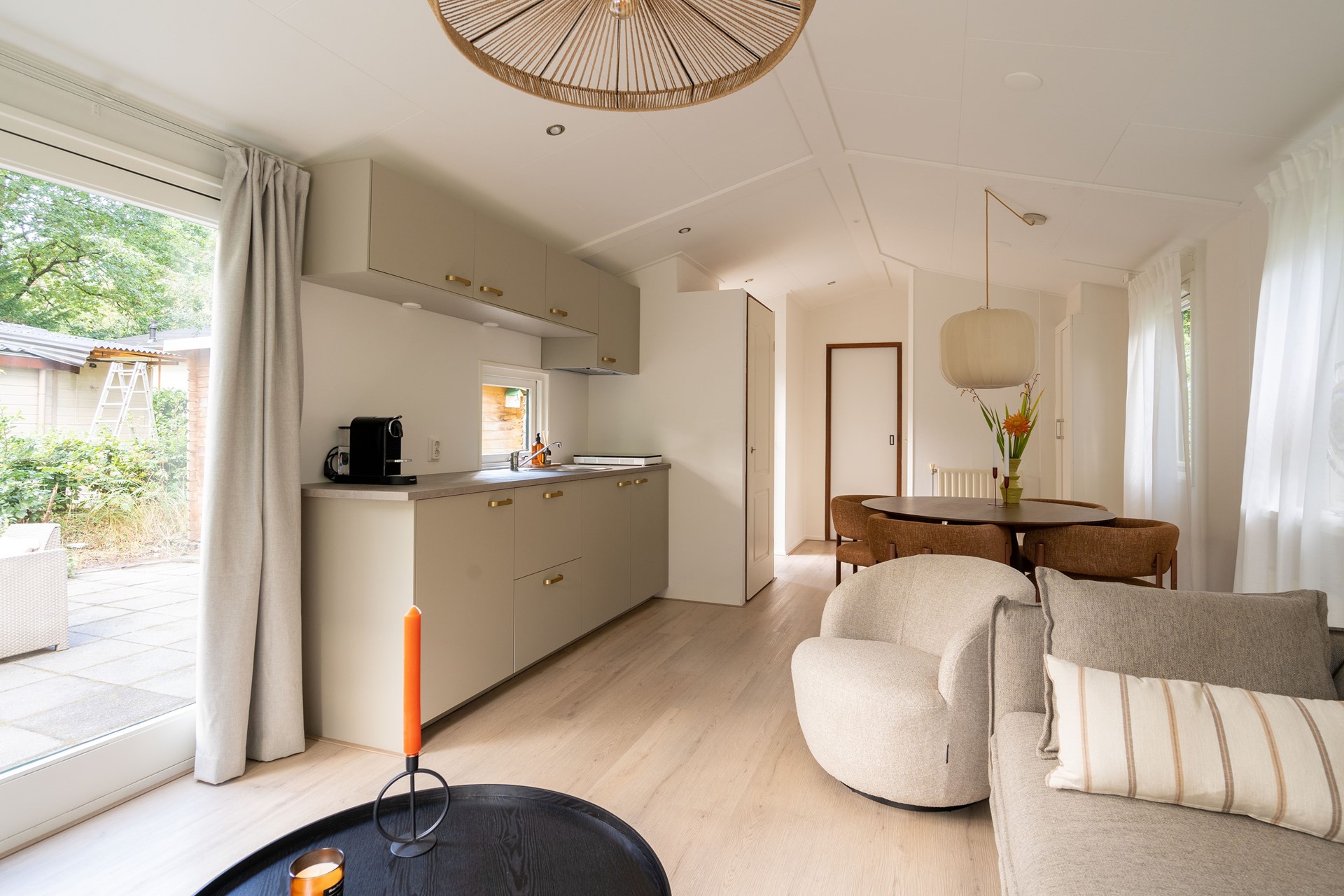Via de entree komt u in de ruime, lichte en moderne woonkamer met schuifpui naar het zonneterras met daarbij een geheel nieuw en modern keukenblok. De woonkamer is extra groot waardoor u heerlijk veel leefruimte heeft. Er is één slaapkamer met een tweepersoonsbed, een vaste kast met schuifdeuren en als groot voordeel: er is een aansluiting voor de wasmachine in het chalet alsook in het tuinhuisje!
