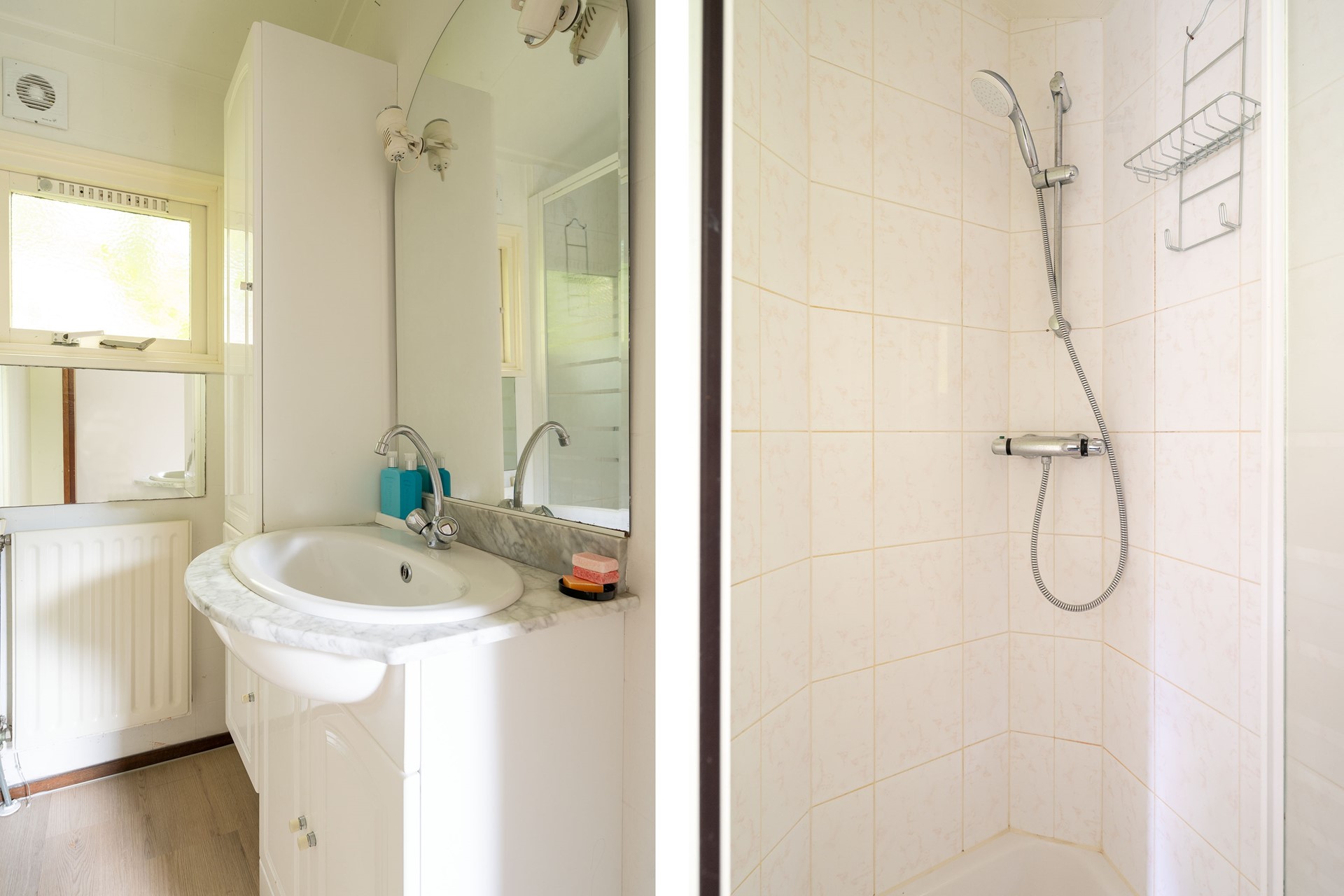 De badkamer is netjes en voorzien van een douchecabine, wastafelmeubel, mechanische ventilatie. Het chalet is zeer praktisch én comfortabel in gebruik. Overigens zijn de vloeren van de woonkamer, badkamer en toilet voorzien van een nieuwe pvc-vloer.