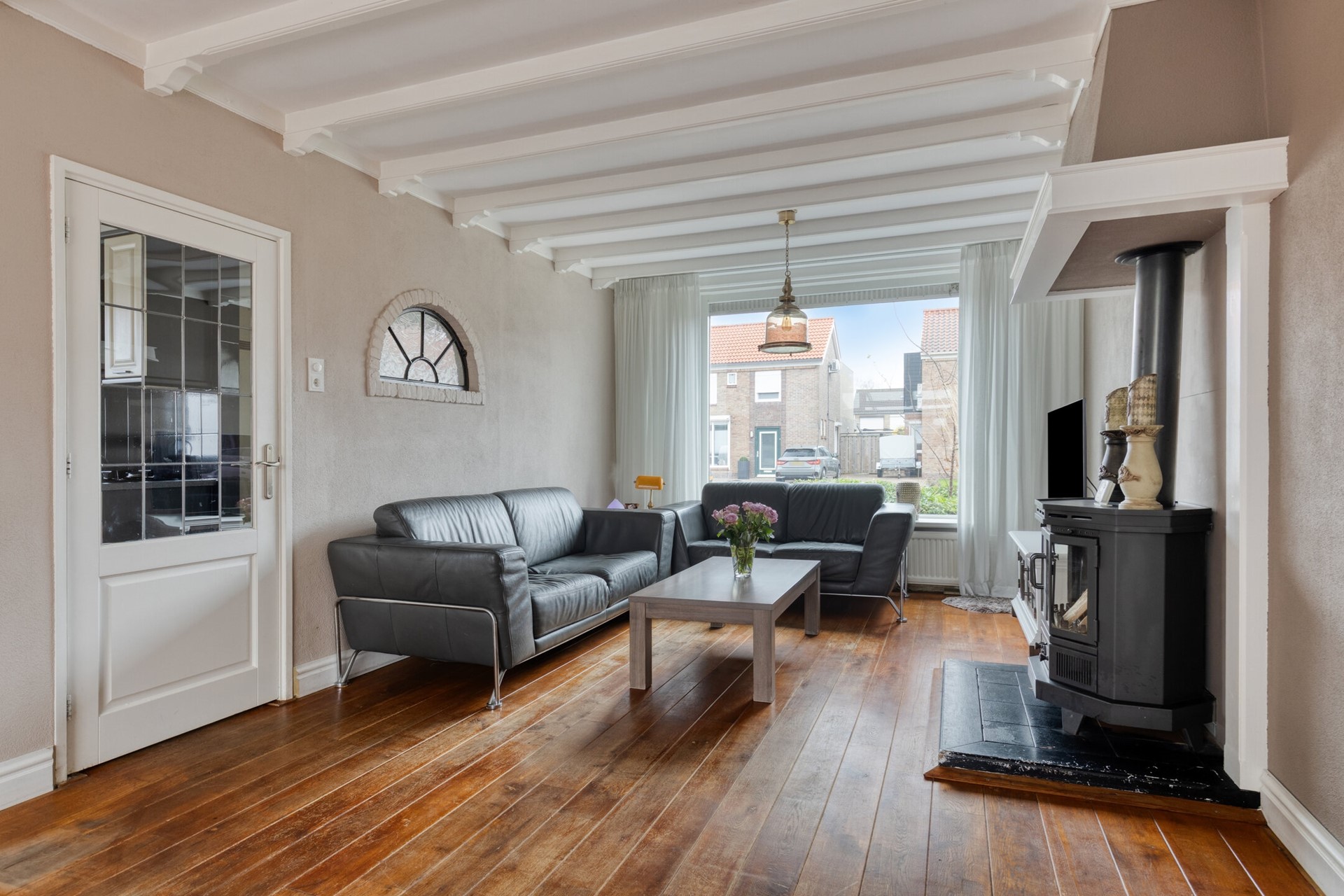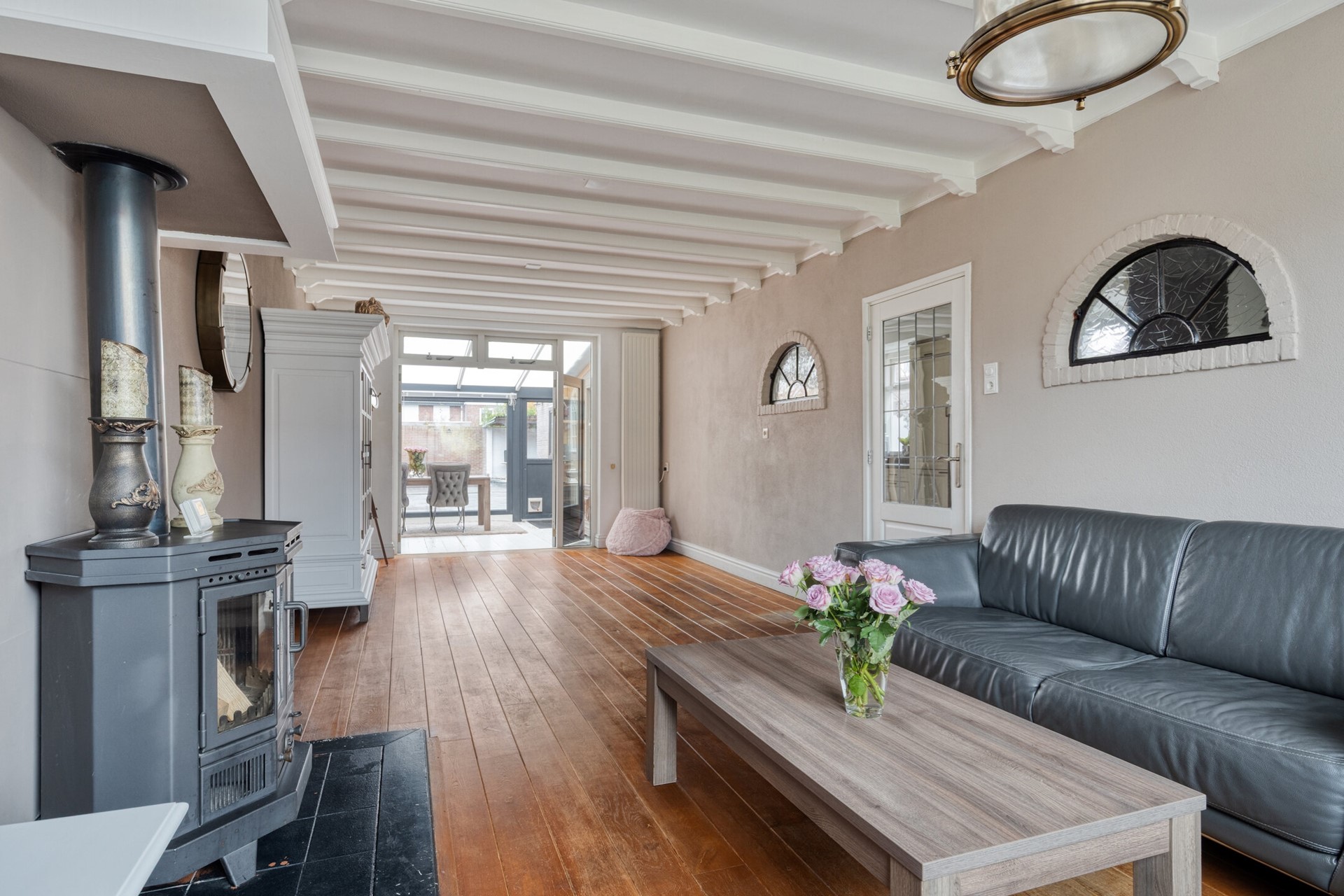 Dan gaan we terug naar de woonkamer. Deze is lekker ruim, heeft een houten vloer en een houtkachel. De aangebouwde serre, geeft nóg meer leefruimte.