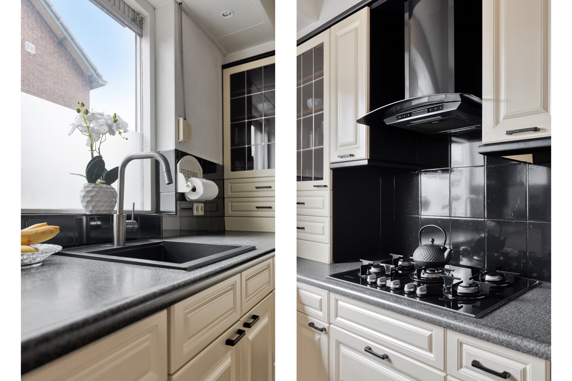 Vanuit de hal, kom je binnen in de keuken. Het is een grote keuken met veel werk- en bergruimte en hij is lekker licht door het grote raam. Qua apparatuur vind je er een 5-pits gasfornuis, afzuigkap en een vaatwasser. Ook is er een 2e aanrechtblad, ideaal voor apparaten die je vaak gebruikt, zoals een koffieapparaat, een waterkoker of een broodrooster.