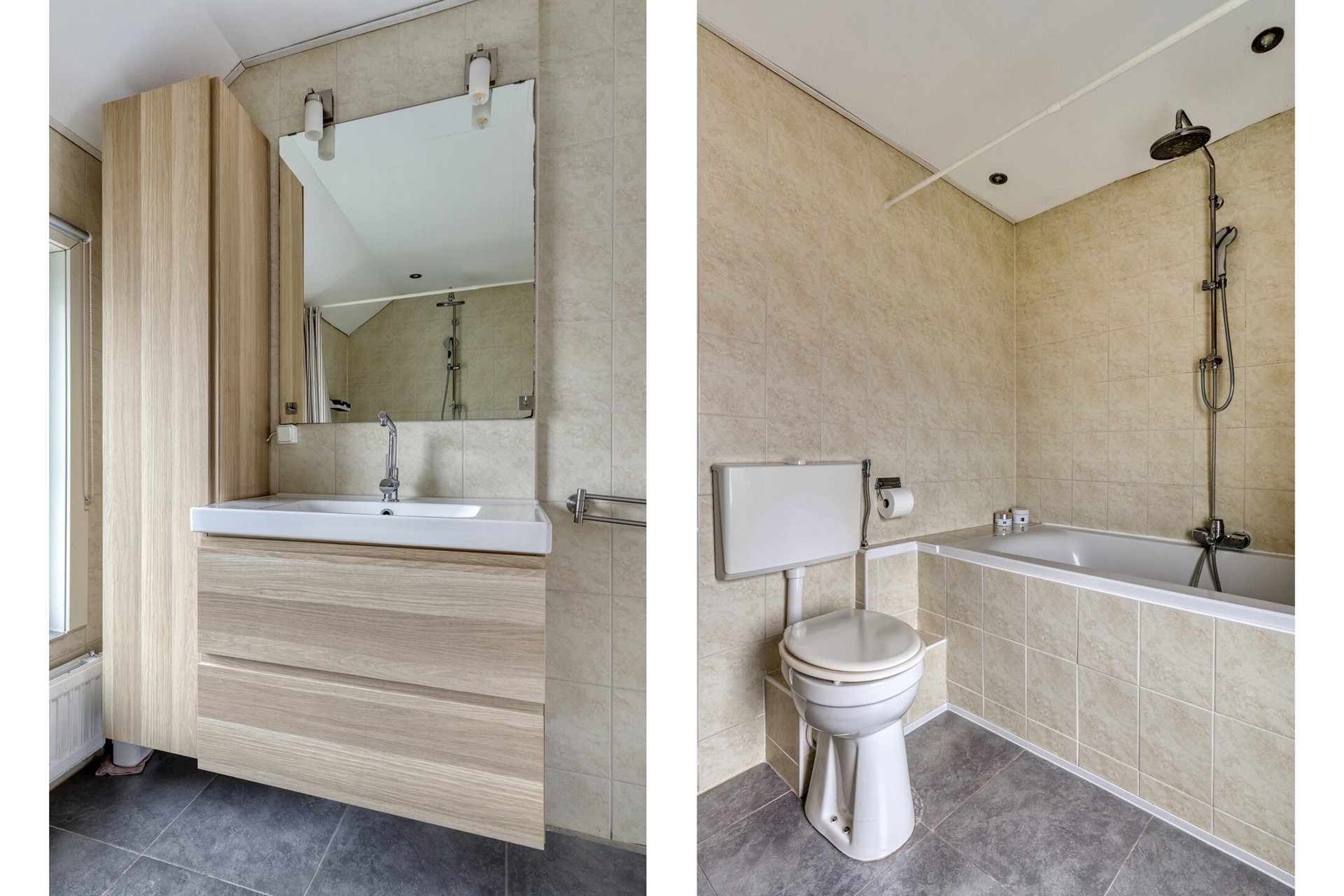 Tot slot komen we bij de badkamer, deze is uitgerust met een ligbad met douche, een staand toilet en een wastafelmeubel.