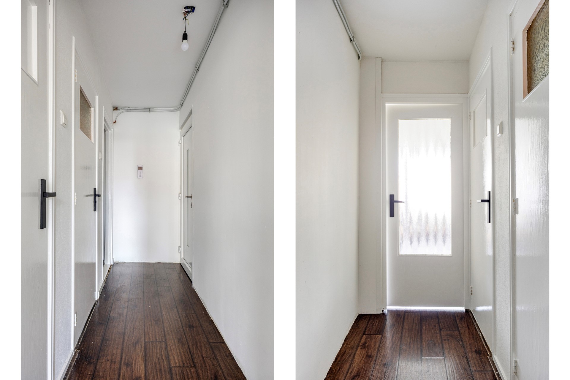 Algemene entree aan de voorzijde van het pand met hal en trapopgang naar de verdieping, waar zich de toegang tot twee bovenwoningen bevindt.