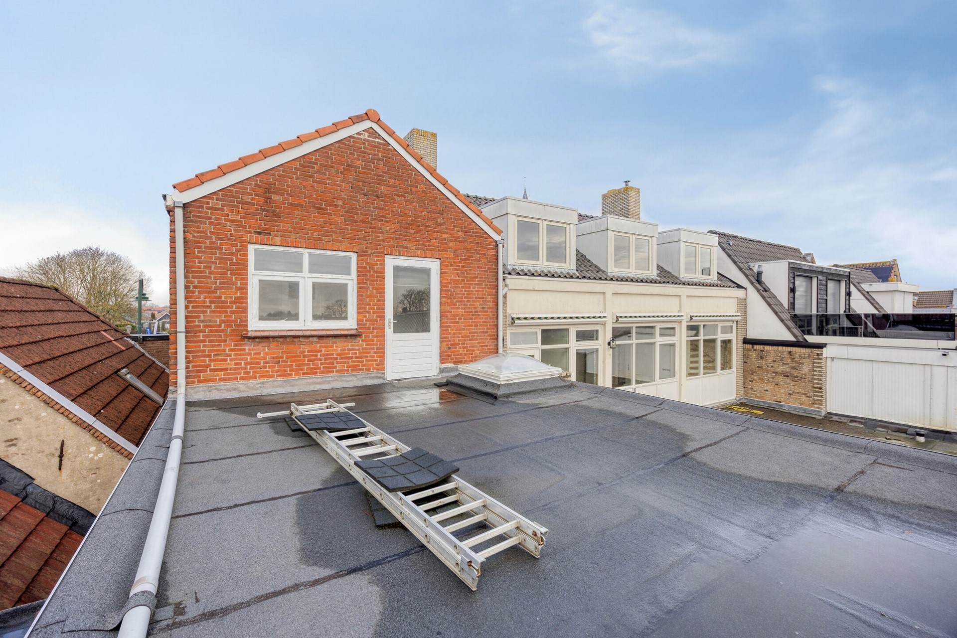 Vanuit deze kamer is er toegang tot het platte dak. Met het aanbrengen van lichte tegels en het plaatsen van tuinmeubilair kan hier een gezellig dakterras worden gerealiseerd - een fijne plek om in alle rust buiten te zitten in het hart van het dorp.
