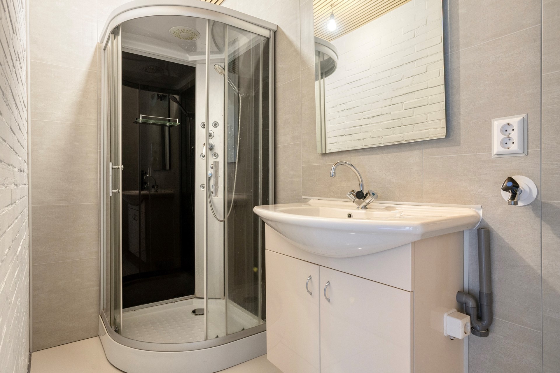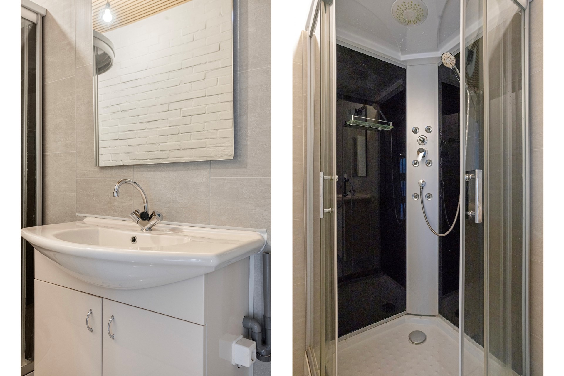 De badkamer is ingericht met wc, wastafelmeubel en douche