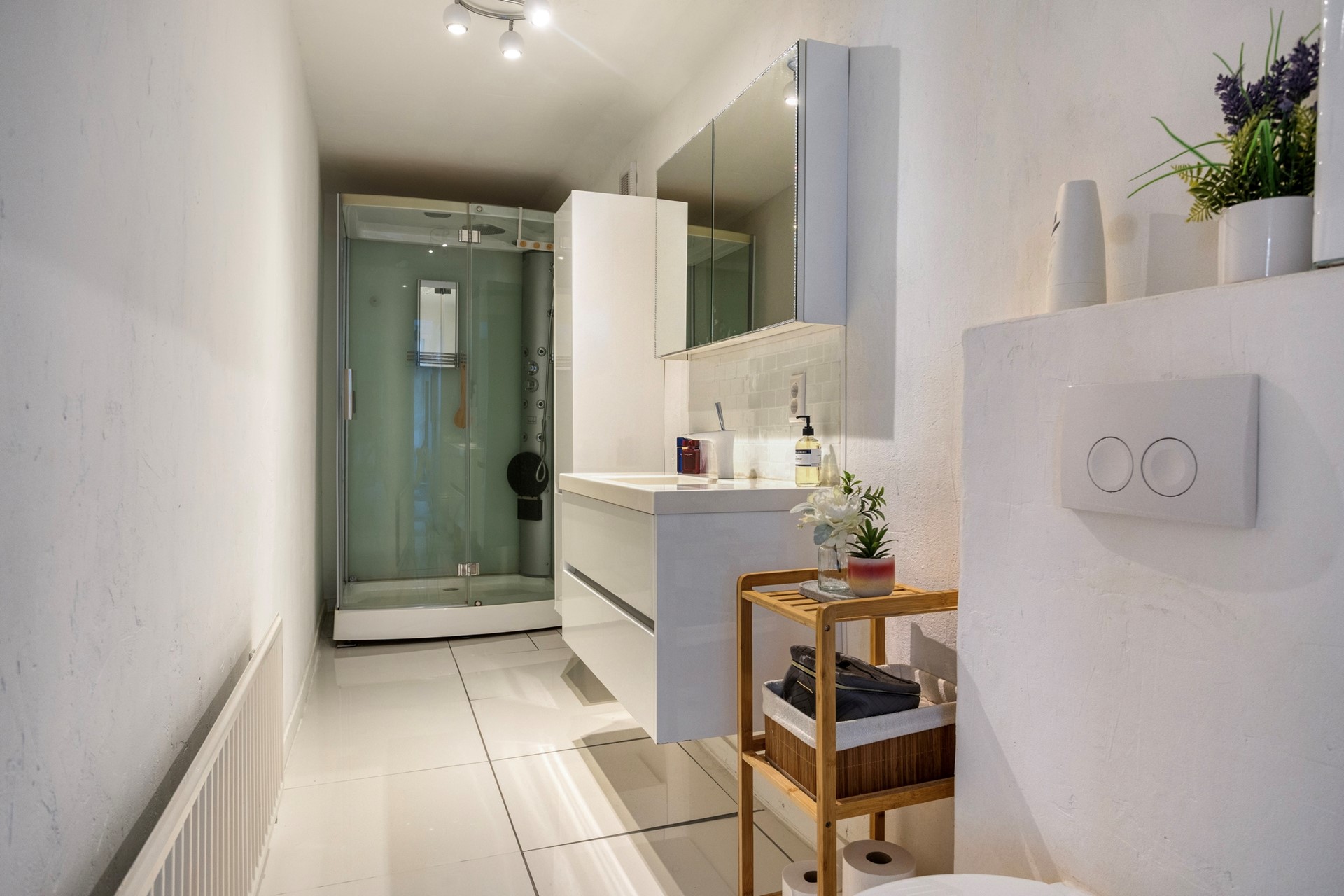 Achter het winkelgedeelte is een ruime hal die toegang geeft tot de 2 kamers van circa 25 m² groot en tot de toiletruimte met staand toilet en fonteintje; tot de badkamer met douche en wastafelmeubel en aansluitpunt wasmachine en tot de keuken met vaatwasser, inductiekookplaat, afzuigkap koelkast en een combi oven.