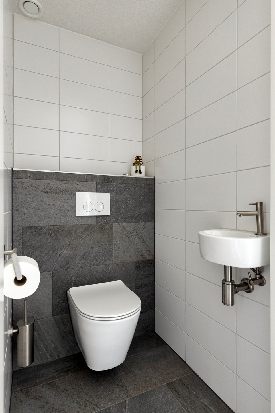 Achter de tweede deur is de toiletruimte. Deze is geheel betegeld in wit/grijs combinatie en heeft een mooi zwevend toilet en een fonteintje.