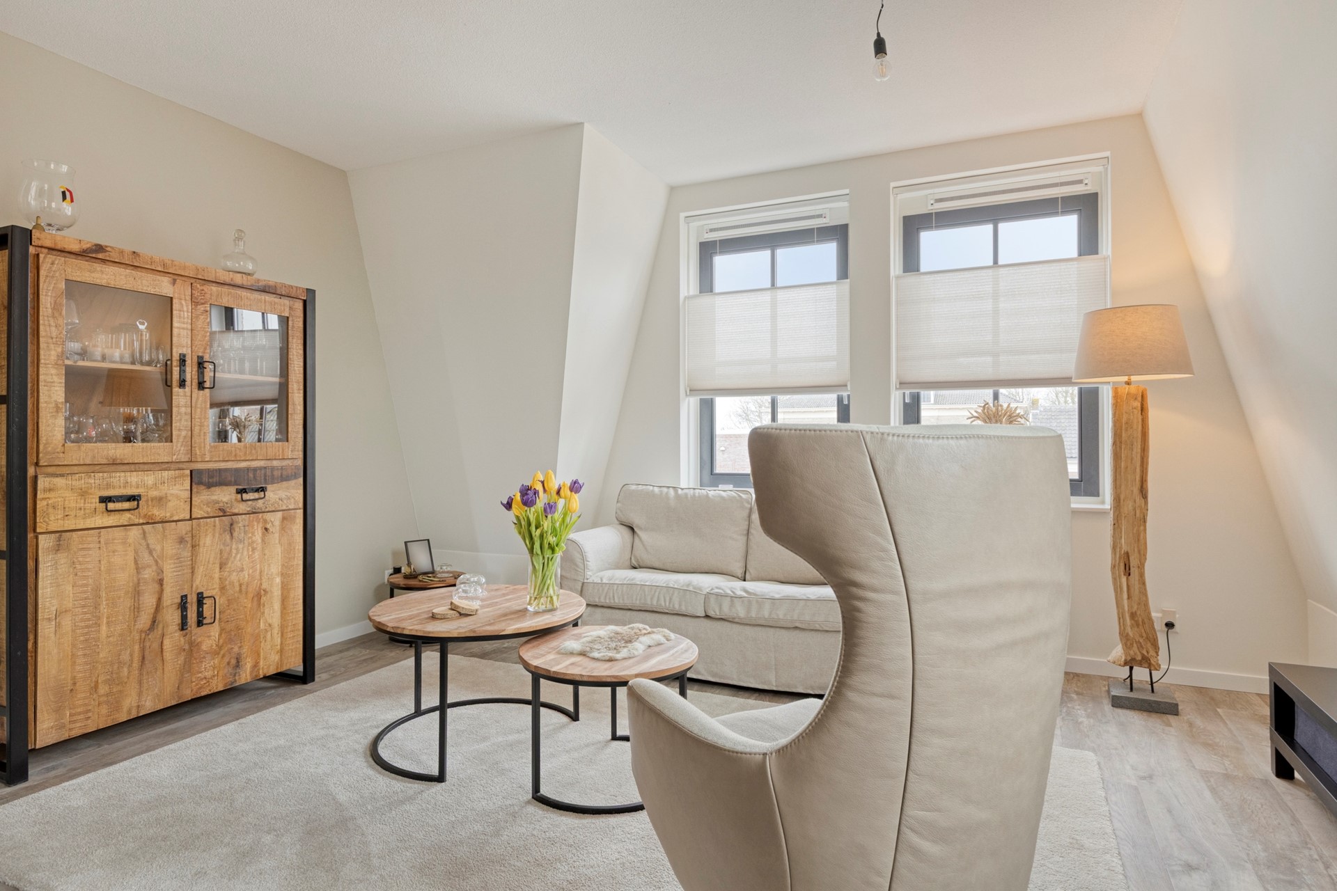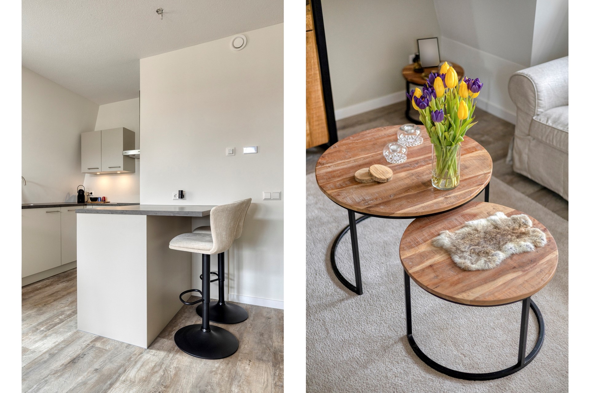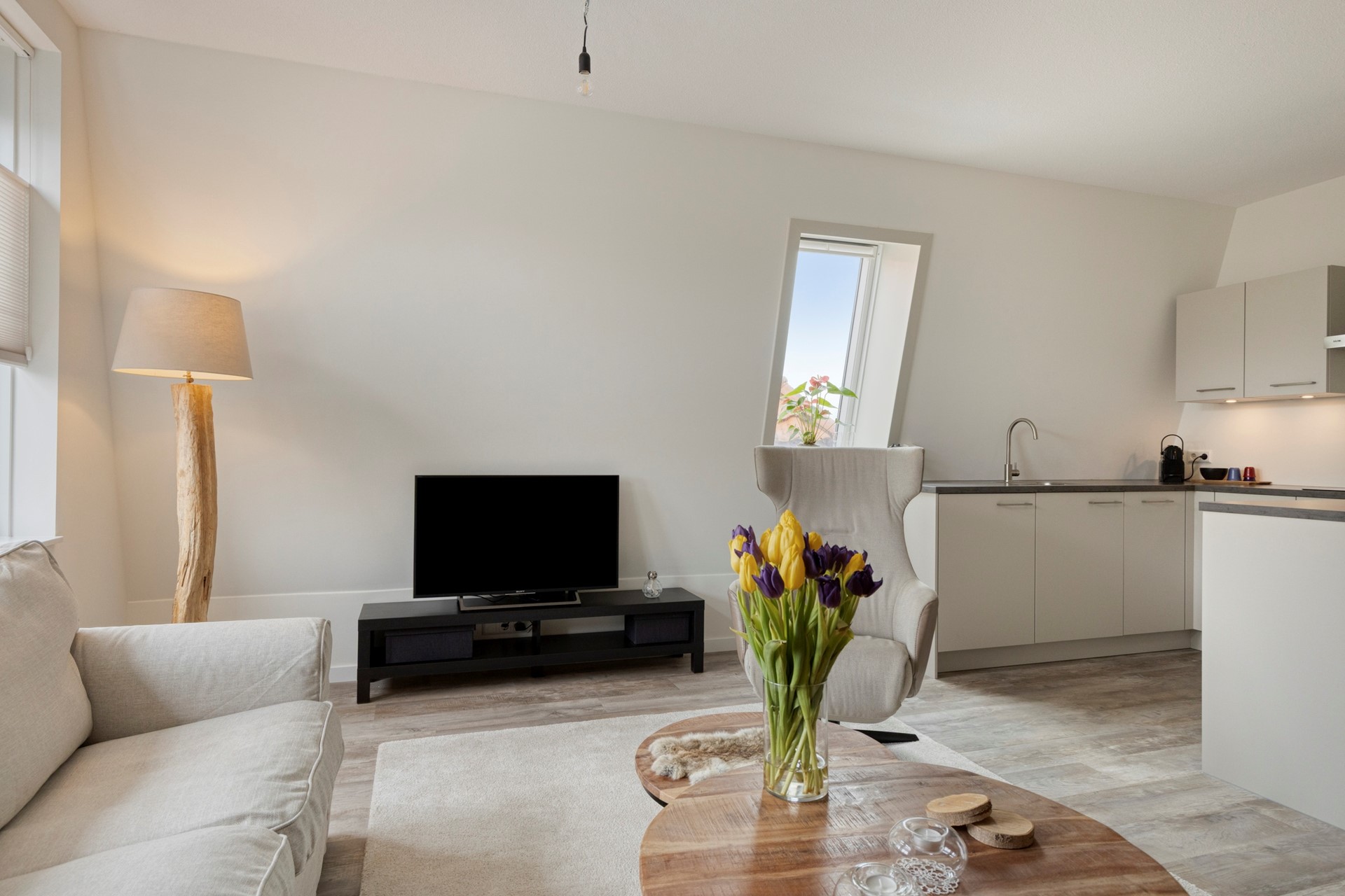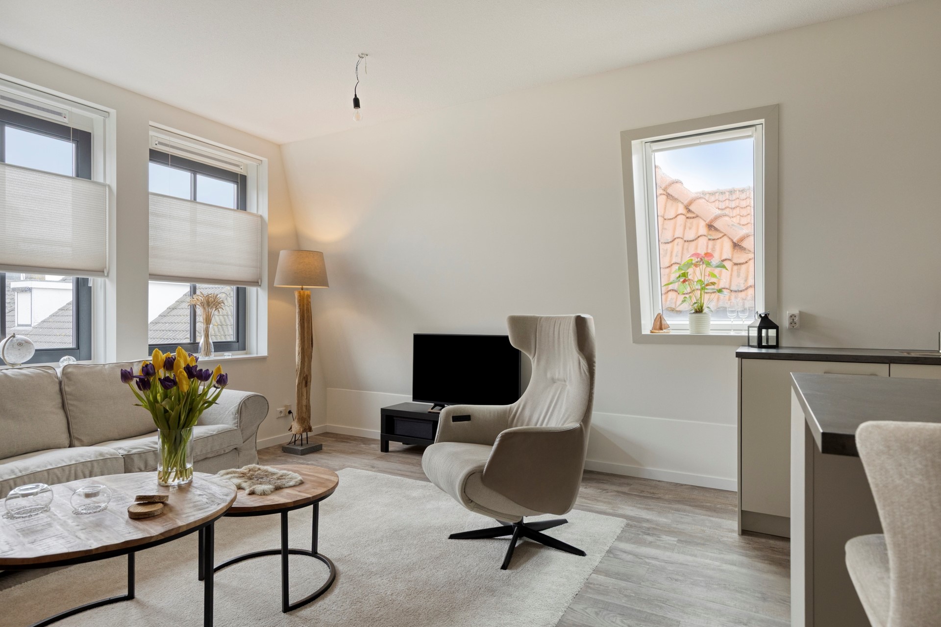 Bij binnenkomst zien we meteen de mooie pvc vloer die in het hele appartement ligt. We lopen de lange hal eerst helemaal door naar de woonkamer met open keuken. De woonkamer is een fijne ruimte met een mooie lichtinval door de ramen in de voorgevel en het dakraam. Door een slimme indeling van de keuken met barretje, blijft er genoeg plaats voor een ruime ruime zithoek over.
