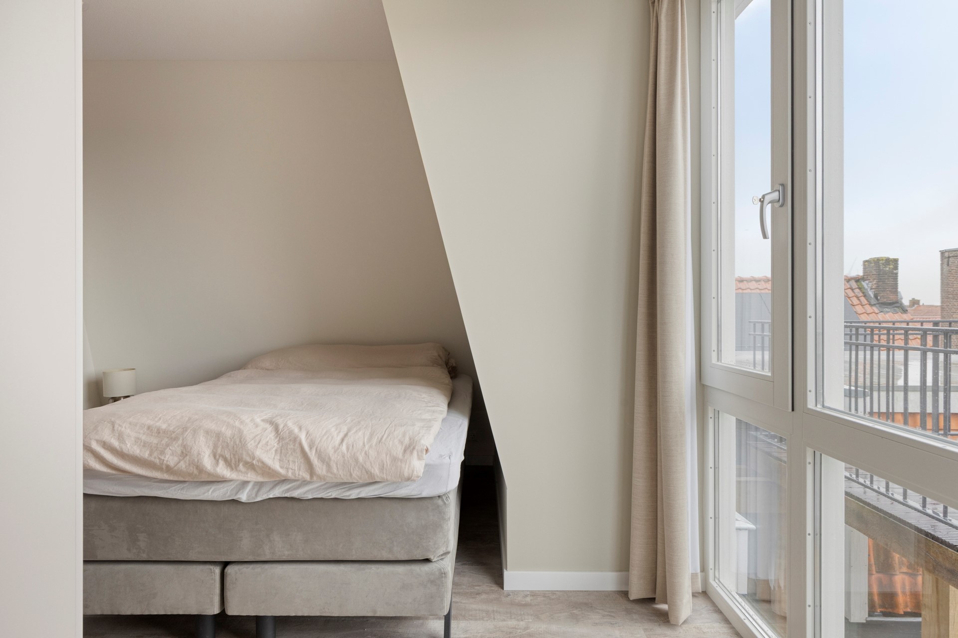 Dan gaan we terug de hal in richting de voordeur voor de slaapkamer met badkamer en-suite. Door de grote ramen, heb je ook hier een fijne lichtinval. De huidige eigenaar heeft qua bed voor een twijfelaar gekozen en heeft daardoor veel kastruimte. Uiteraard kan je ook voor een groter bed kiezen.