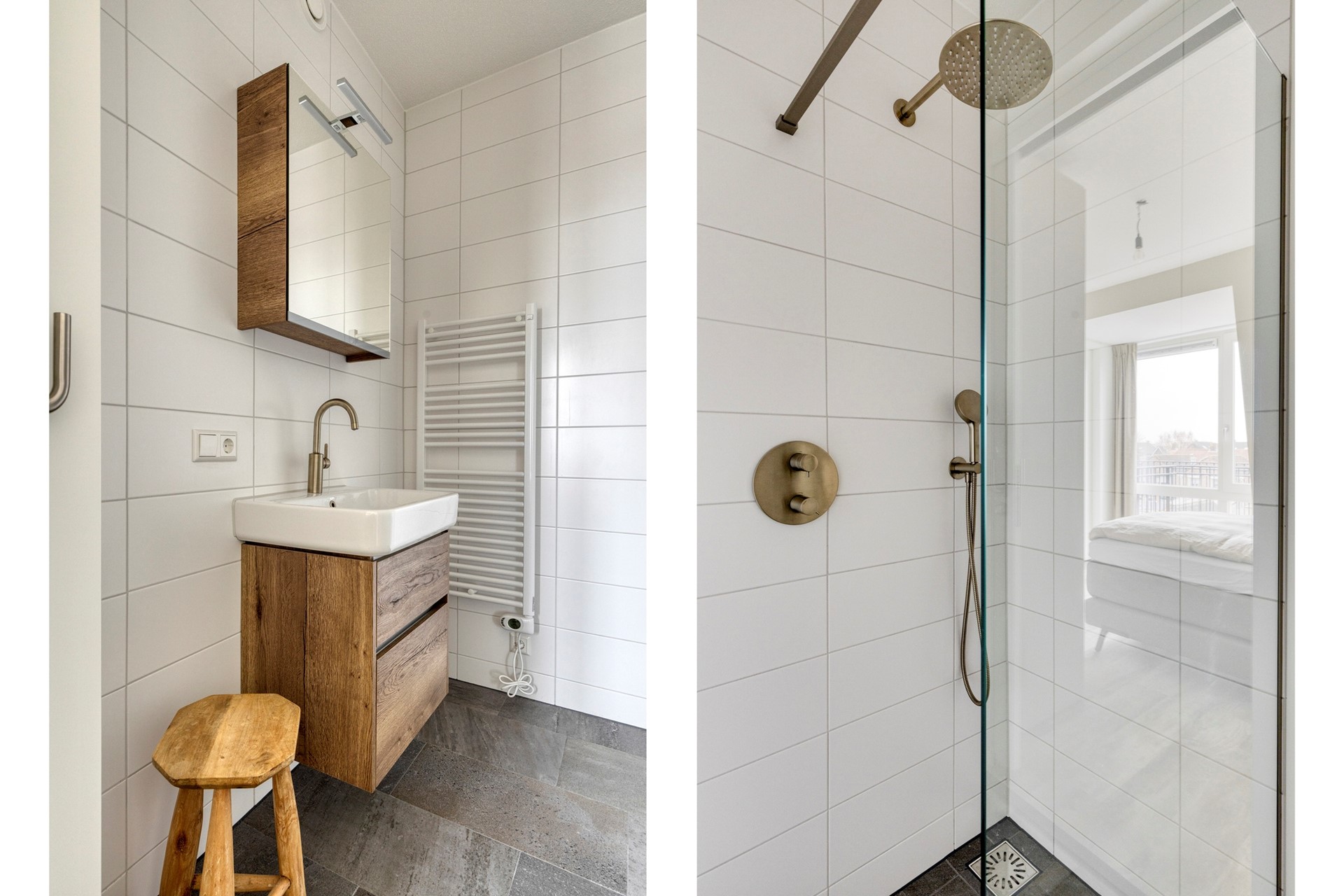 Een houtlook wastafelmeubel en een spiegelkastje zorgen voor de nodige bergruimte.