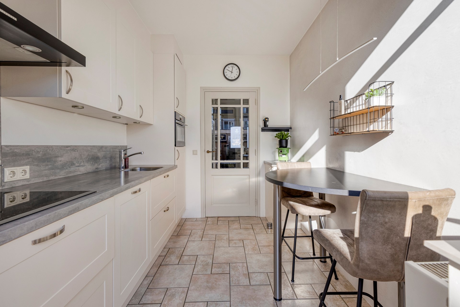 De gezellige en verzorgde keuken is ingericht met een rechte keukenopstelling en voorzien van een fraai kunststof werkblad, diverse boven- en onderkastjes en de benodigde inbouwapparatuur: een inductiekookplaat, afzuigkap, vaatwasser, koelkast en een combi oven/magnetron. Vanuit de keuken is er een directe deur naar de achtertuin.