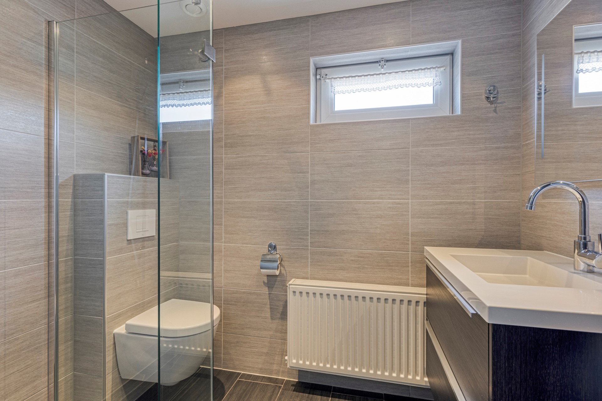 De badkamer is uitgevoerd in een mooie neutrale kleurstelling en praktisch ingericht met een zwevend toilet, een wastafelmeubel en een inloopdouche met zowel een regendouche als een handdouche.
