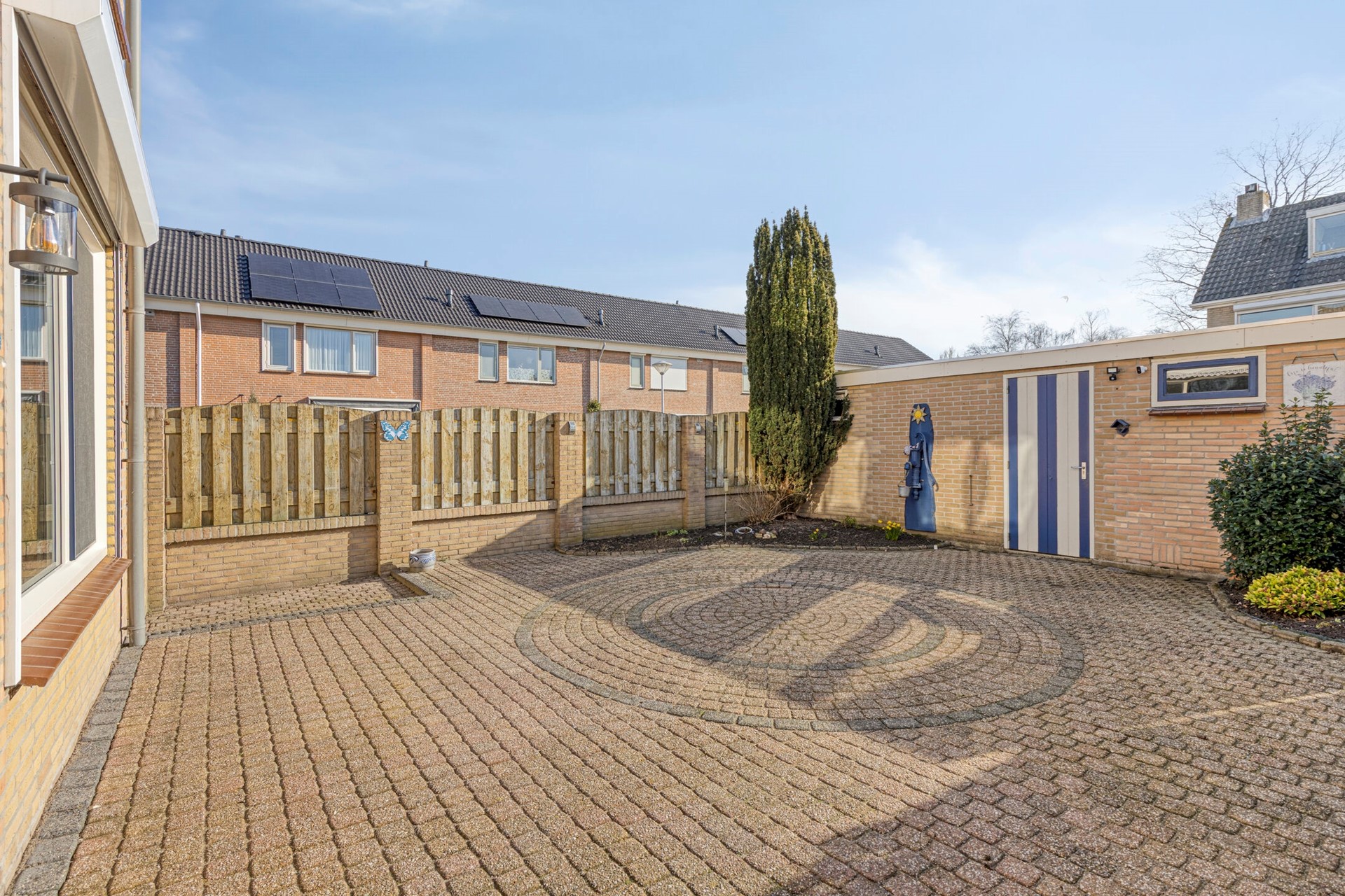 De achtertuin is volledig voorzien van sierbestrating en daardoor lekker onderhoudsvriendelijk aangelegd. Daarnaast zorgen twee groene borders voor een verzorgde uitstraling. De tuin is via een poort naast het huis eenvoudig bereikbaar.