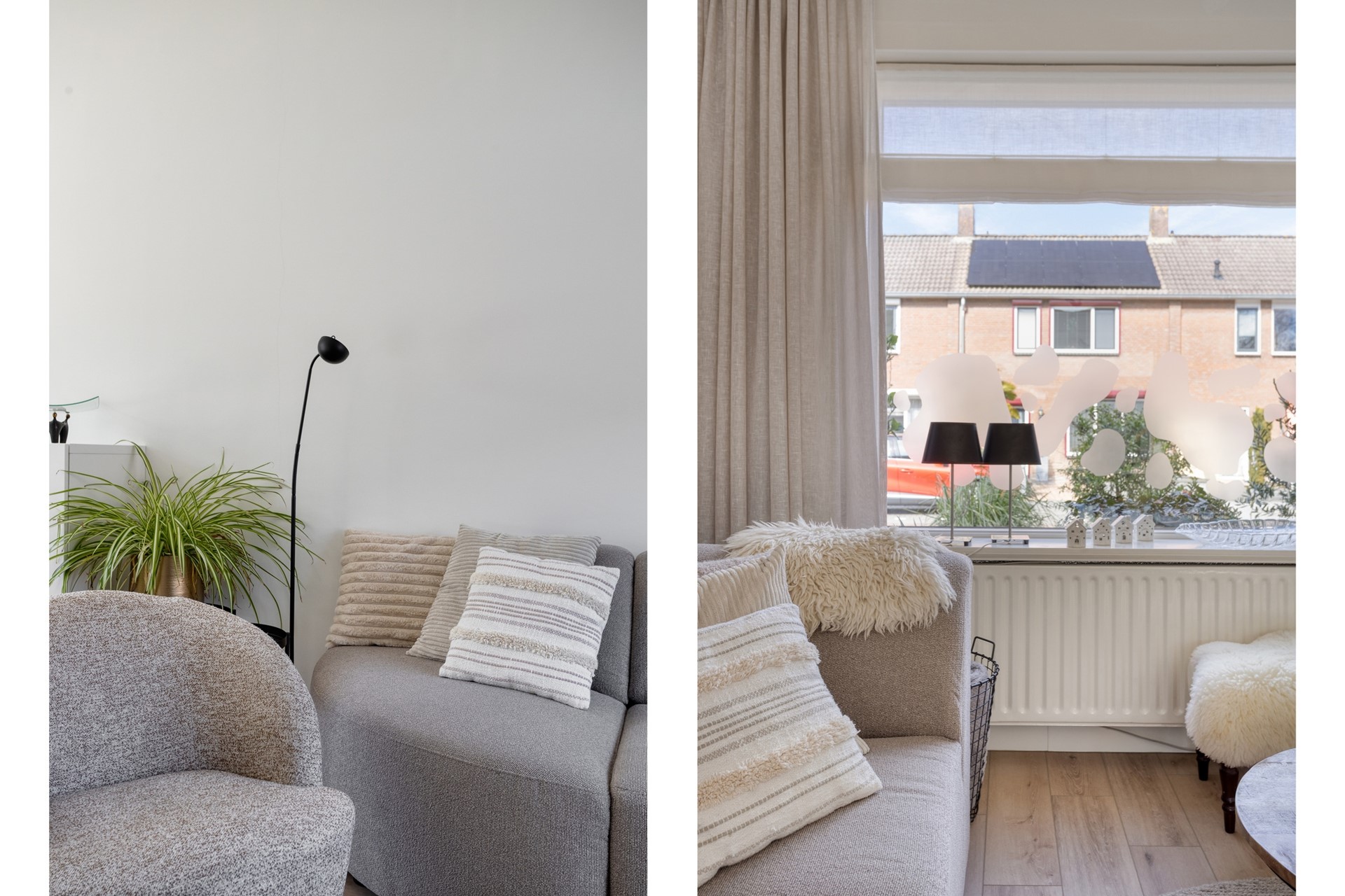 De doorzonwoonkamer is dankzij de grote raampartijen heerlijk licht. De strak gestuukte wanden en de frisse pvc-vloer vormen een neutrale en moderne basis die in de hele ruimte is doorgetrokken.