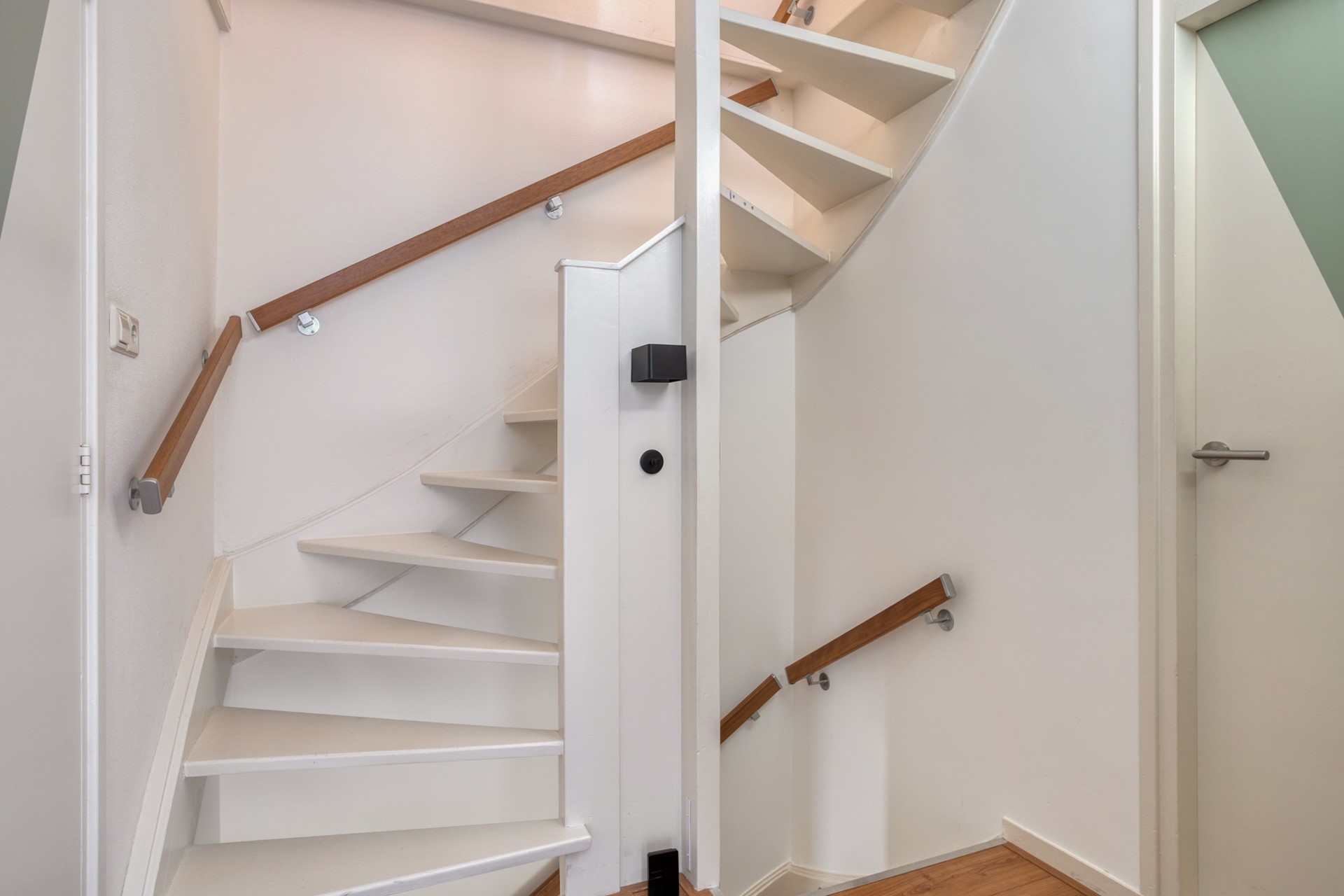 Hier is de moderne toiletruimte, die stijlvol is uitgevoerd met een wandcloset en een fonteintje. Daarnaast geeft de hal toegang tot een praktische, ruime trapkast, de trapopgang naar de eerste verdieping en de woonkamer.