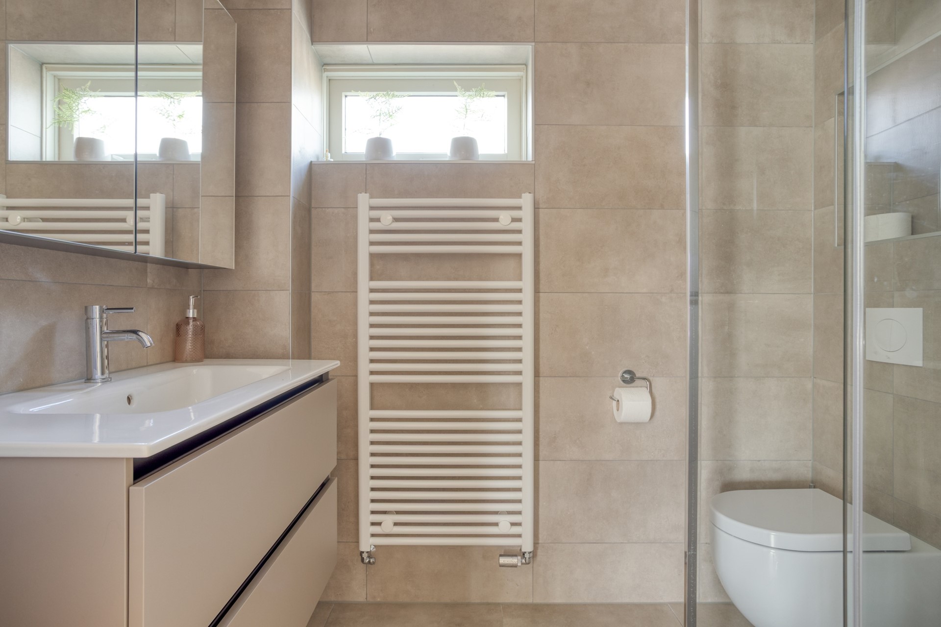 De badkamer is een moderne plek om te ontspannen. De ruimte is volledig betegeld in een stijlvolle beige-grijze kleurstelling en is uitgerust met een inloopdouche, een wastafelmeubel en een wc.