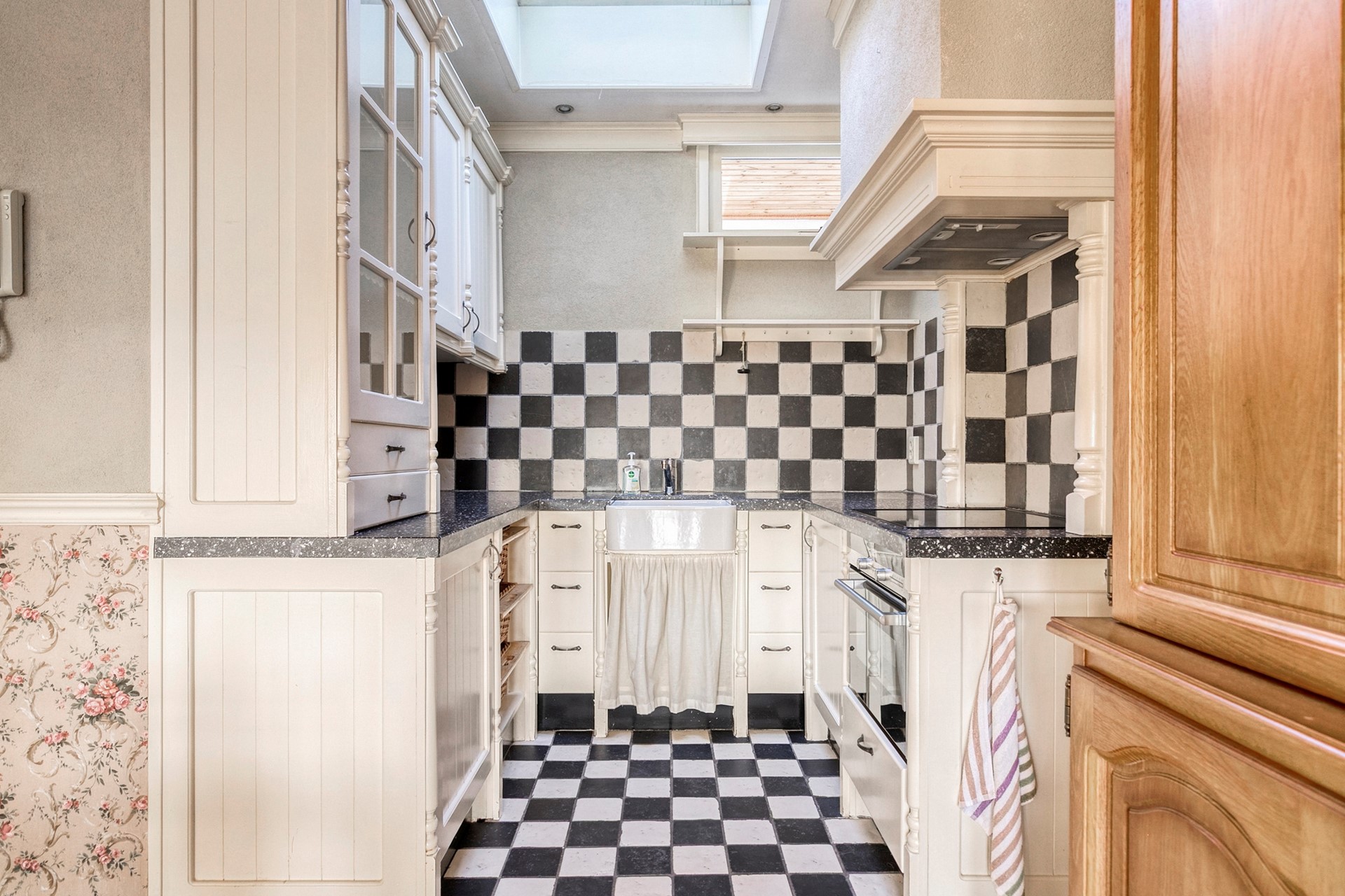 De open keuken staat in een praktische U-opstelling en is voorzien van een granieten werkblad, keramische kookplaat, afzuigkap en kleine koelkast.