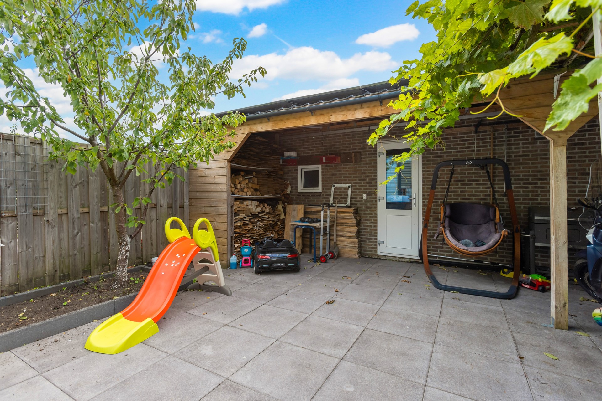 Achter het huis ligt een zonnige tuin van 59 m² met overkapping, stenen berging en achterom, ideaal voor ontspanning, spelen of een BBQ.