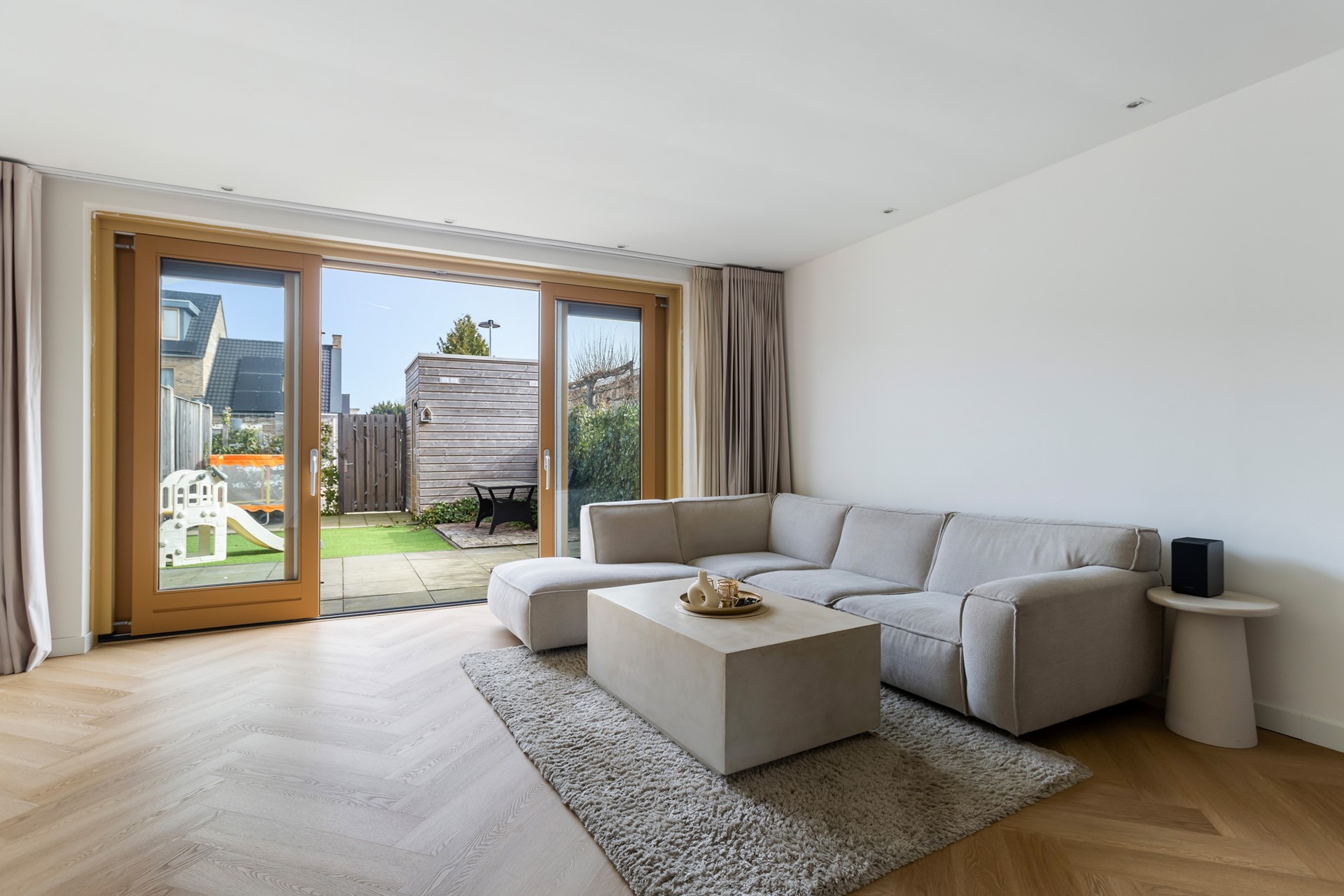Vanuit de hal kom je in de ruime en lichte woonkamer. Door de grote schuifpui aan de achterzijde valt er veel natuurlijk daglicht naar binnen en heb je een mooi zicht op de tuin. De schuifpui zorgt er bovendien voor dat binnen en buiten op een prettige manier met elkaar verbonden zijn.
