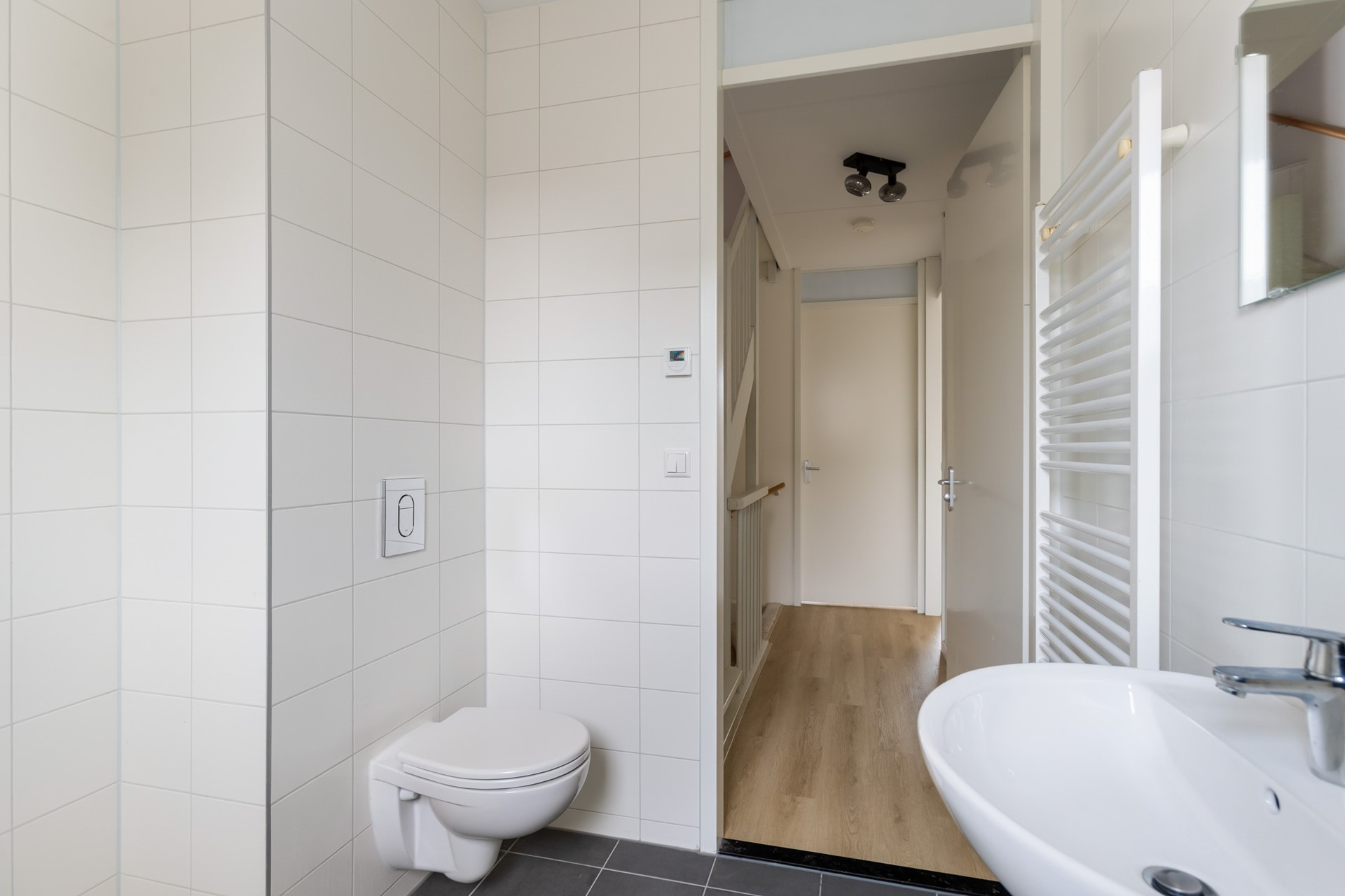 De standaard netjes betegelde badkamer is voorzien van een inloopdouche, een wastafel en een inbouwtoilet. Daarnaast beschikt de badkamer over een raam, wat zorgt voor prettig daglicht en natuurlijke ventilatie. De ruimte is afgewerkt met grijze vloertegels en witte wandtegels, wat zorgt voor een nette en verzorgde uitstraling.