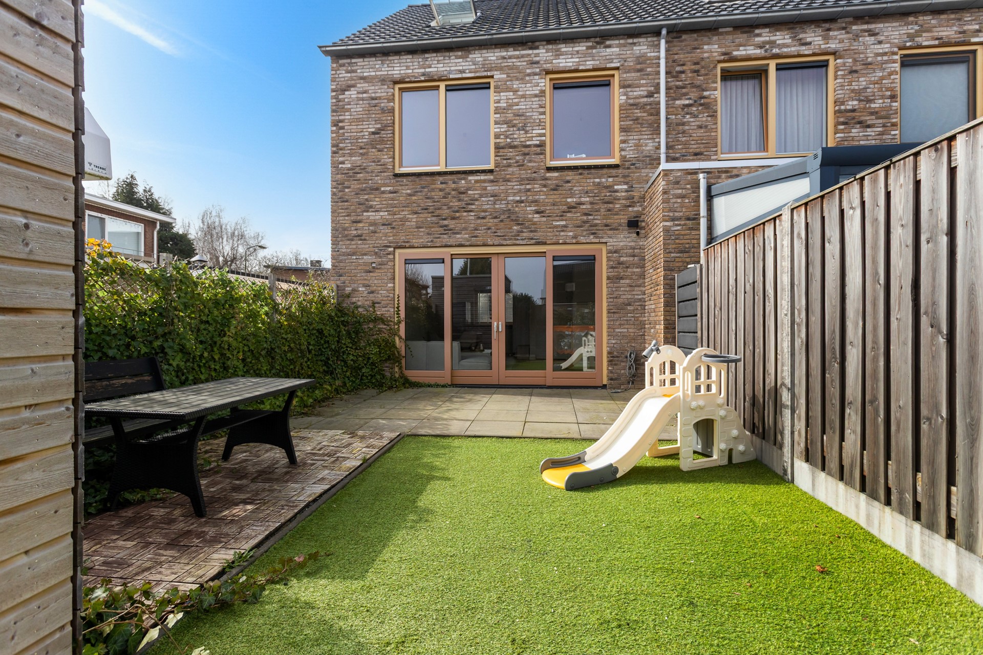 De achtertuin is gelegen op het oosten, waardoor je hier vooral in de ochtend en vroege middag heerlijk van de zon kunt genieten. De tuin is onderhoudsvriendelijk aangelegd met een combinatie van bestrating en kunstgras.