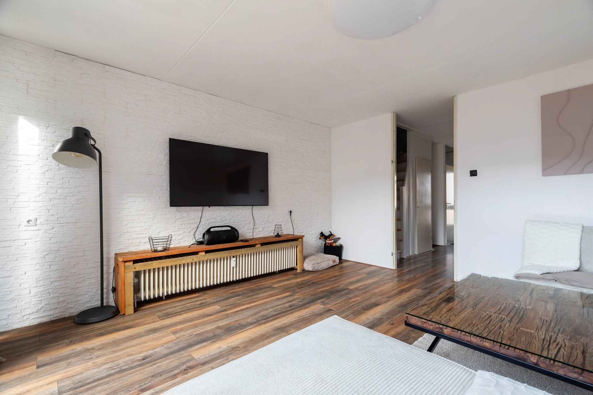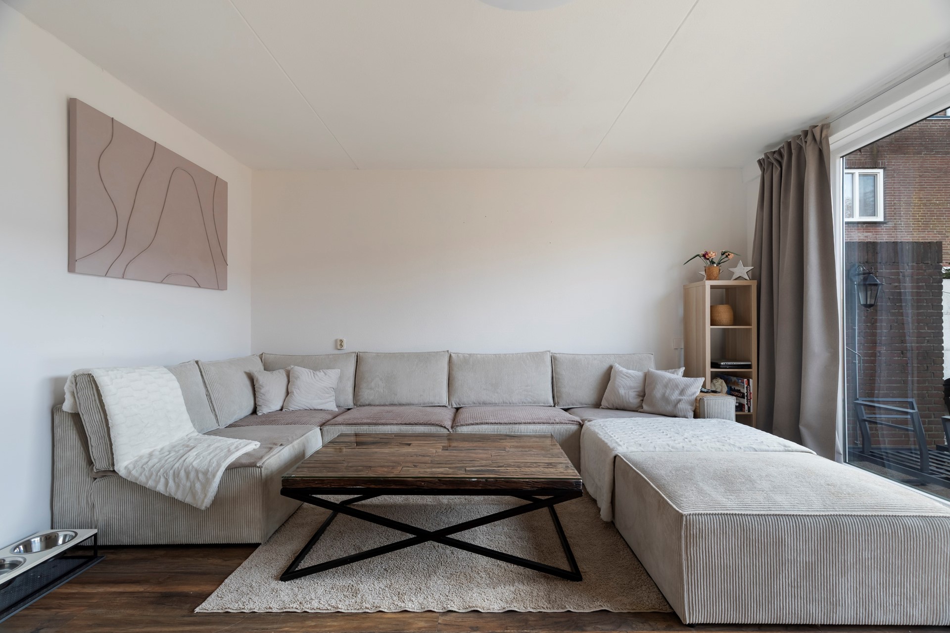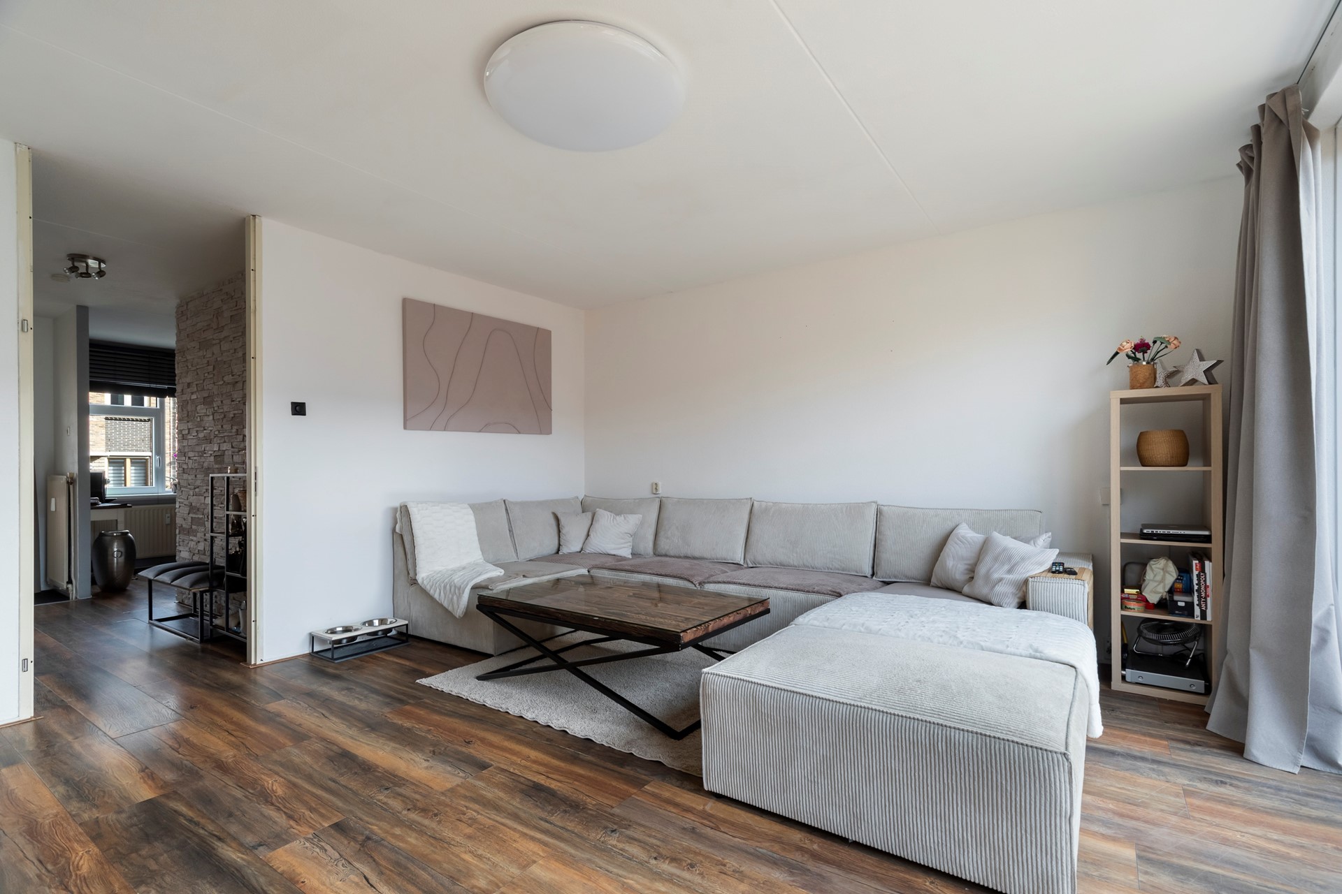 De woonkamer bevindt zich aan de achterzijde van de woning en is eveneens voorzien van laminaat. Dankzij de praktische indeling is er voldoende ruimte voor een royale bank en een gezellige zithoek.
