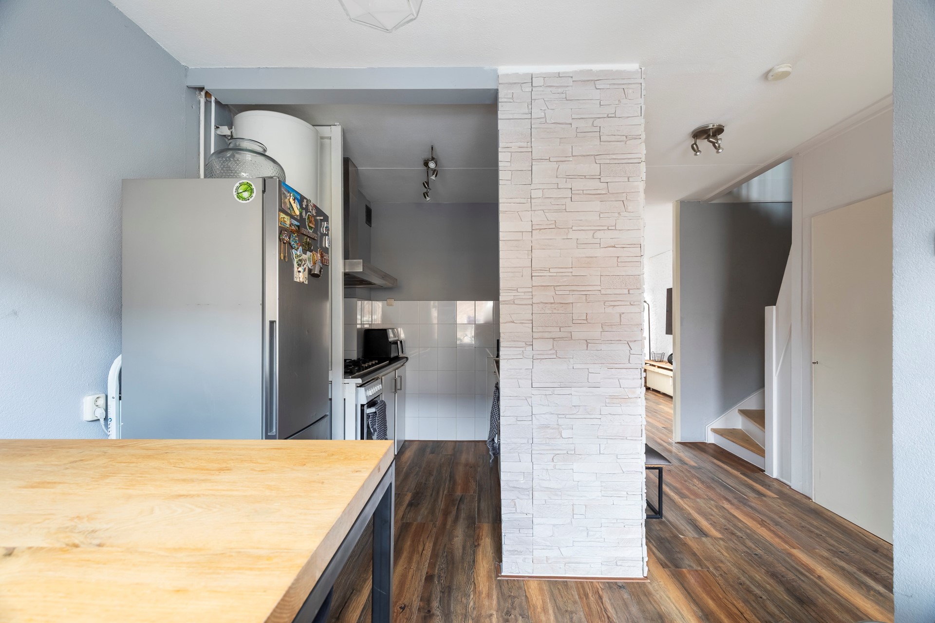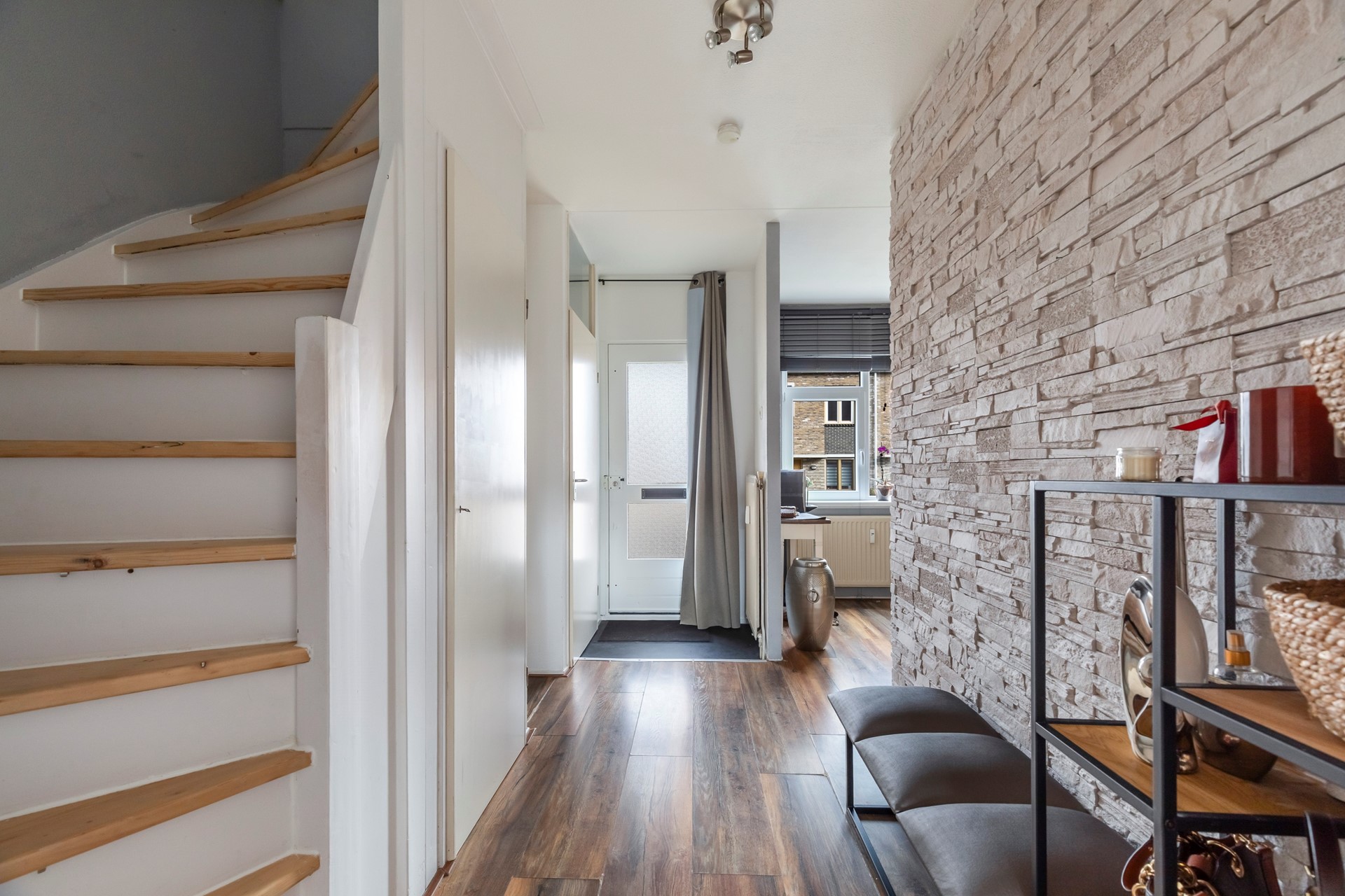 Via de entree kom je binnen in de hal. Hier bevinden zich de meterkast (8 groepen en een slimme meter), het toilet, de trapopgang naar de eerste verdieping en een open verbinding naar de keuken.