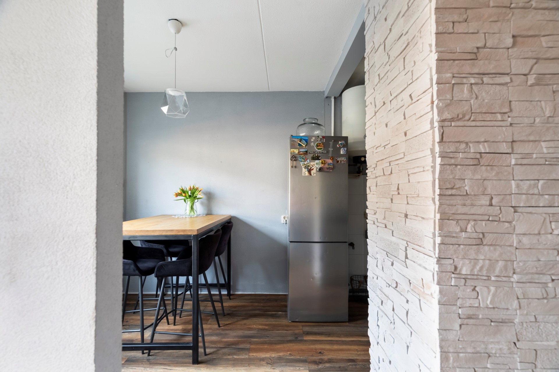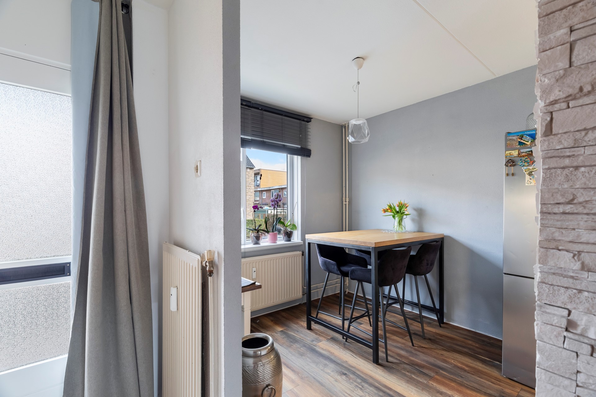 Naast de keuken is voldoende ruimte voor het plaatsen van een eettafel, waardoor koken en tafelen op een gezellige manier samenkomen.