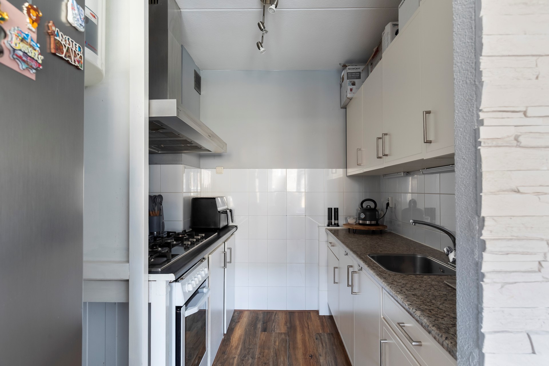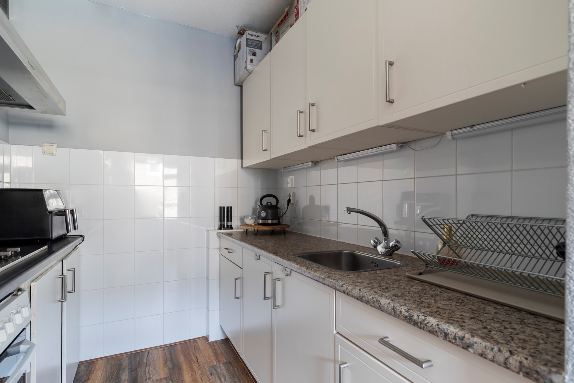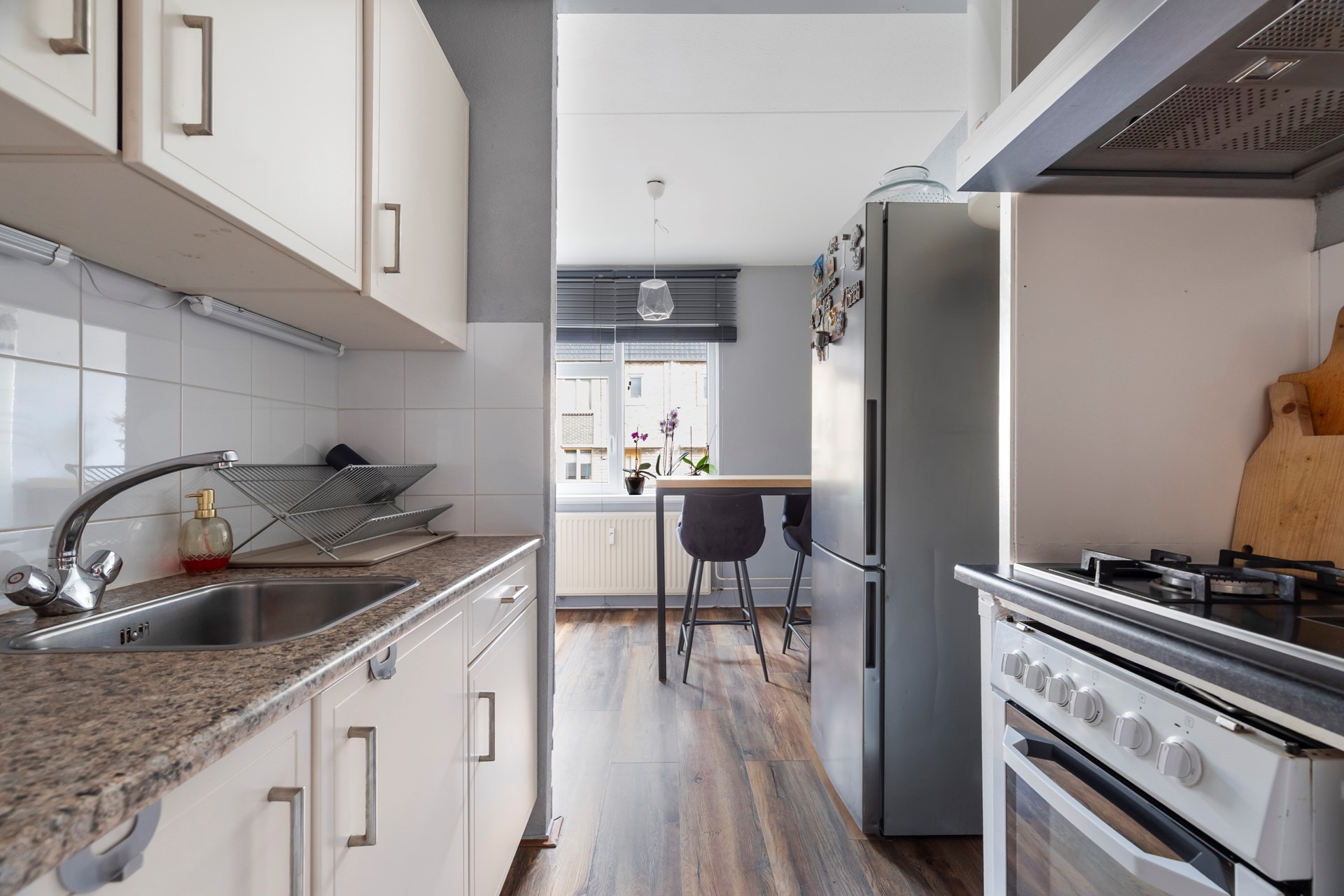 De keuken staat in open verbinding met de hal en is uitgevoerd in een neutrale beige kleurstelling. De vloer is voorzien van laminaat en de wanden zijn betegeld met witte wandtegels tot halverwege. De keuken beschikt over een gaskookplaat, een losse oven en een losse koelkast. Er is onlangs een overeenkomst getekend voor de eigendom van de boiler, waardoor de nieuwe eigenaren deze kunnen overnemen zonder een nieuwe overeenkomst met Eneco te hoeven sluiten.