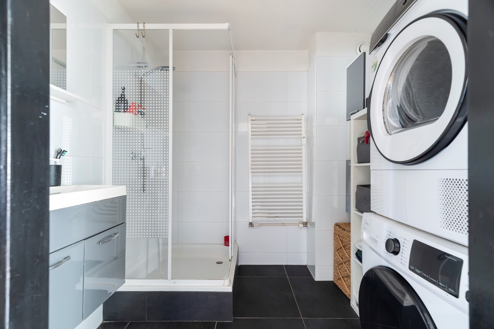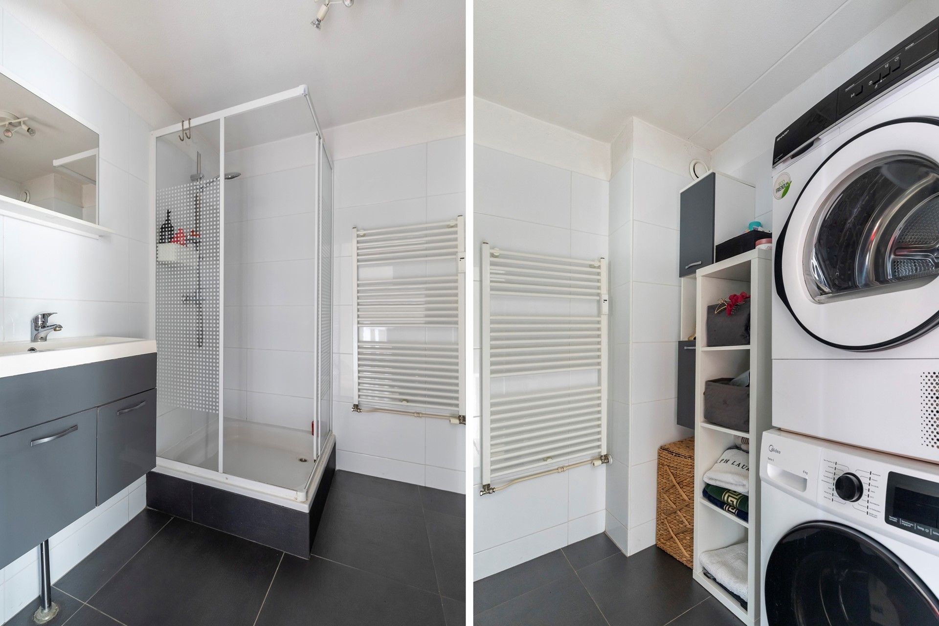 De badkamer is praktisch ingericht en uitgevoerd met antraciet vloertegels en witte wandtegels. De ruimte beschikt over een douche, een wastafel met meubel, een designradiator en aansluitingen voor een wasmachine en droger. Een complete en functionele badkamer met een moderne uitstraling.