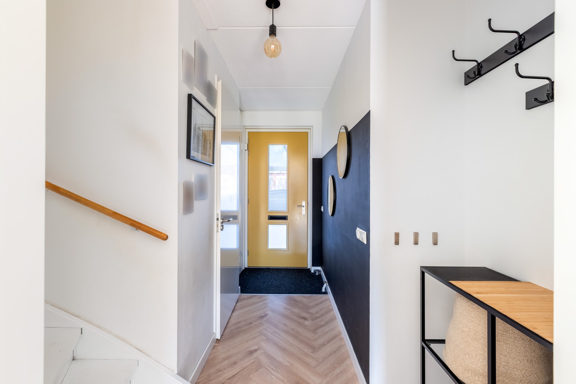 Entree in de hal met meterkast (11 groepen en 3 aardlekschakelaars), stadsverwarmingsunit en een modern betegelde toiletruimte met wandcloset en fonteintje. Vanuit de hal is er toegang tot de woonkamer en de trap naar de eerste verdieping.