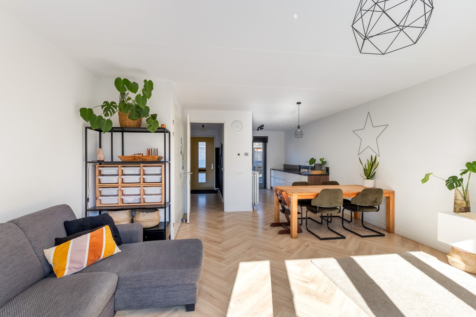 De ruime en lichte woonkamer heeft openslaande deuren naar de achtertuin en is strak afgewerkt met gestucte wanden, een laminaat visgraatvloer en een plafond met spackspuitwerk. De woonkamer beschikt daarnaast over een praktische trapkast.