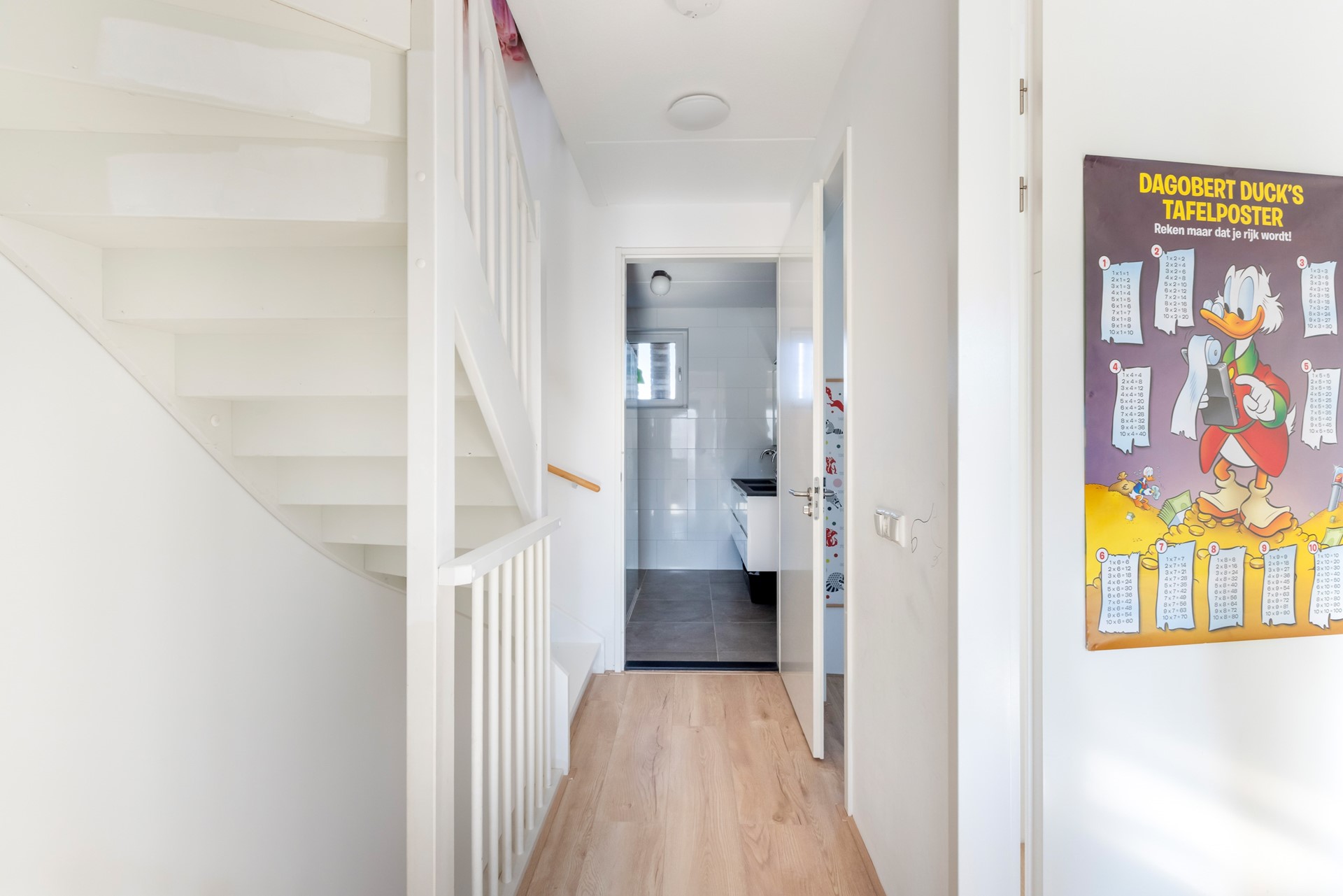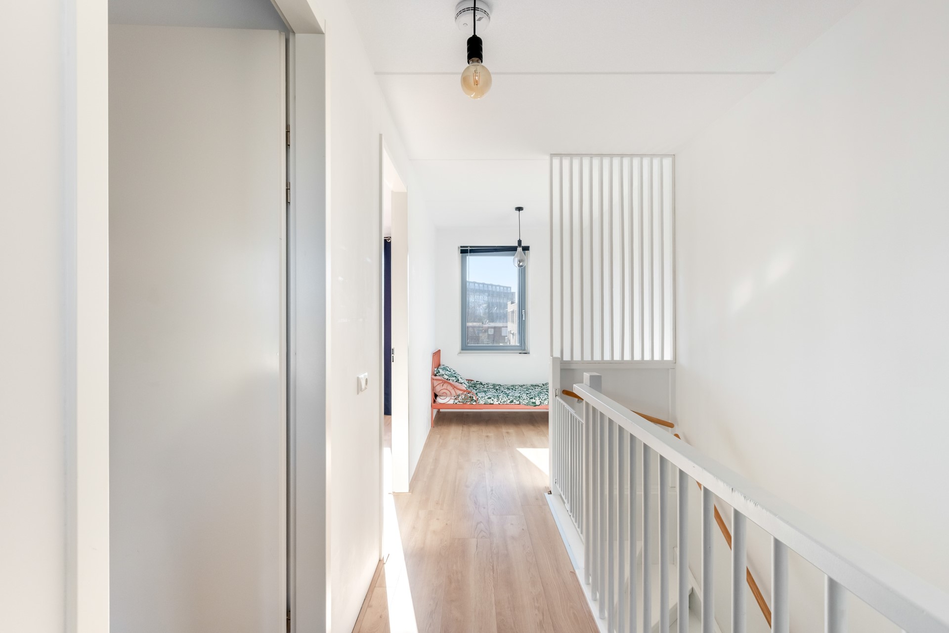 Overloop met toegang tot drie slaapkamers, de badkamer en de trap naar de tweede verdieping.