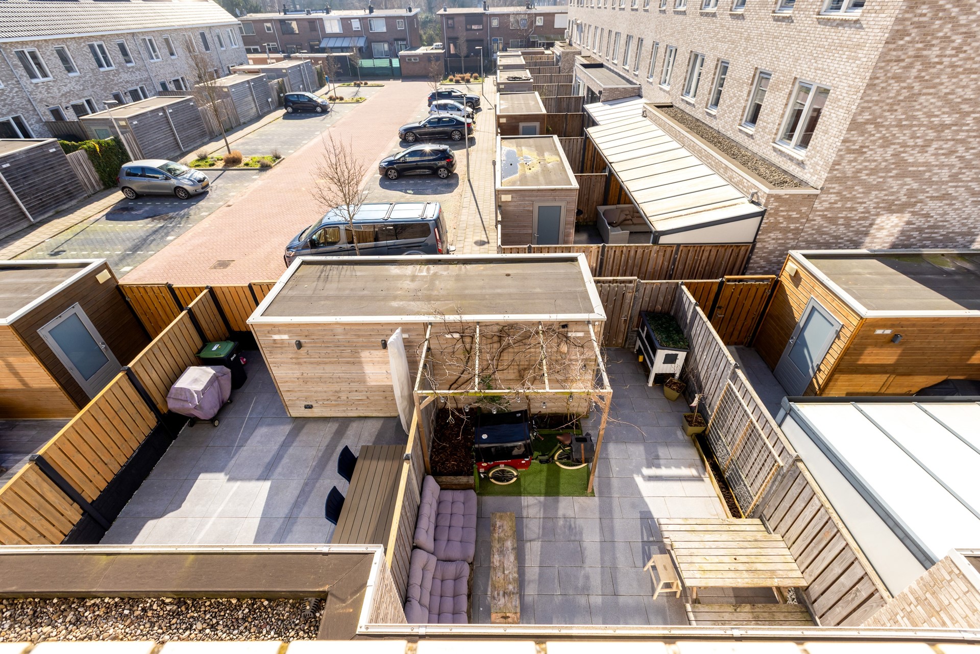 De achtertuin op het zuidoosten is onderhoudsvriendelijk aangelegd met betontegels, een kunstgrasveldje met pergola en een vrijstaande berging. Via de achterom is het gezamenlijke parkeerterrein bereikbaar.