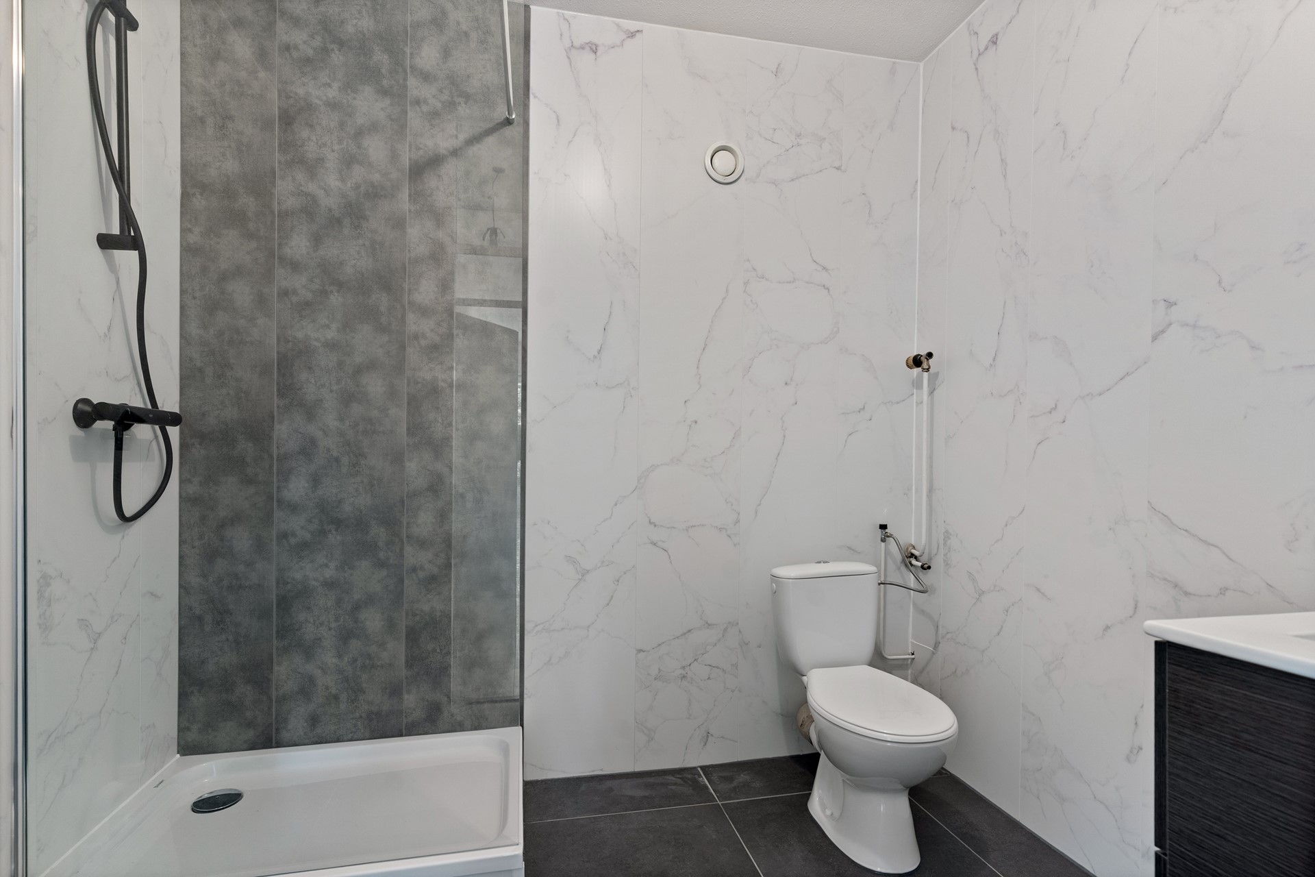 Bij binnenkomst via de nette entree valt direct de moderne afwerking op. De ruime hal geeft toegang tot meterkast, stookruimte en ruim toilet.