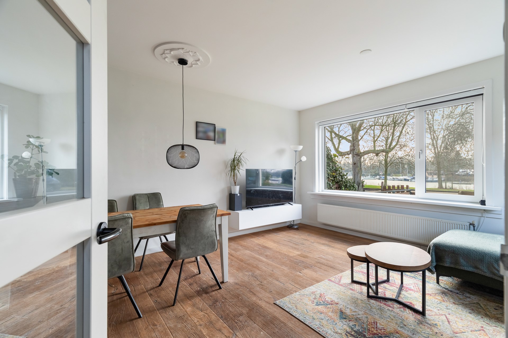 Sfeervolle woonkamer met eikenhouten vloer, veel lichtinval en een schitterend uitzicht over het Wantij. De woning is voorzien van kunststof kozijnen met deels triple beglazing. Vanuit de woonkamer is er toegang tot de moderne open keuken. De woonkamer beschikt aan de voorzijde over elektrische zonwering.