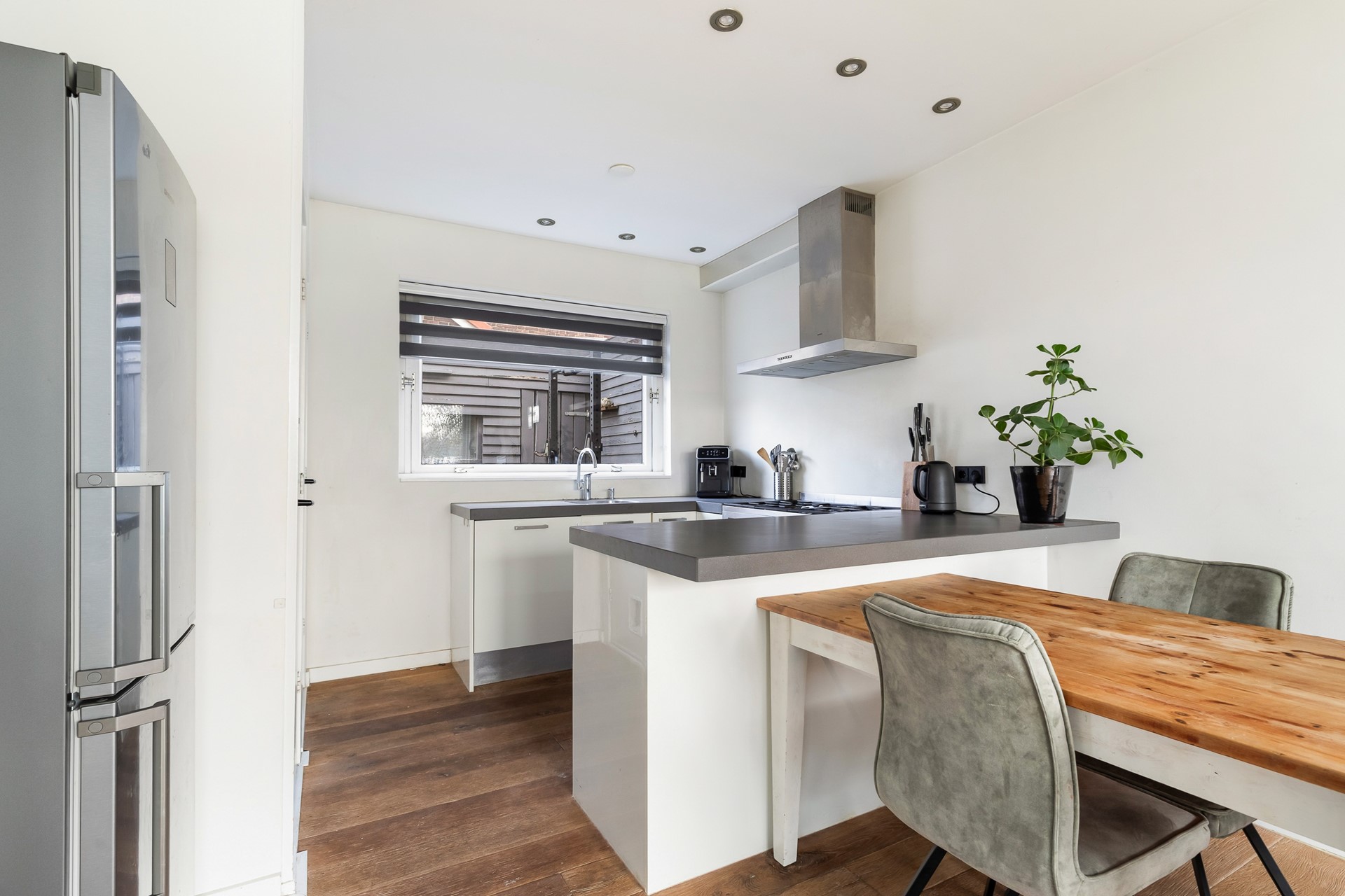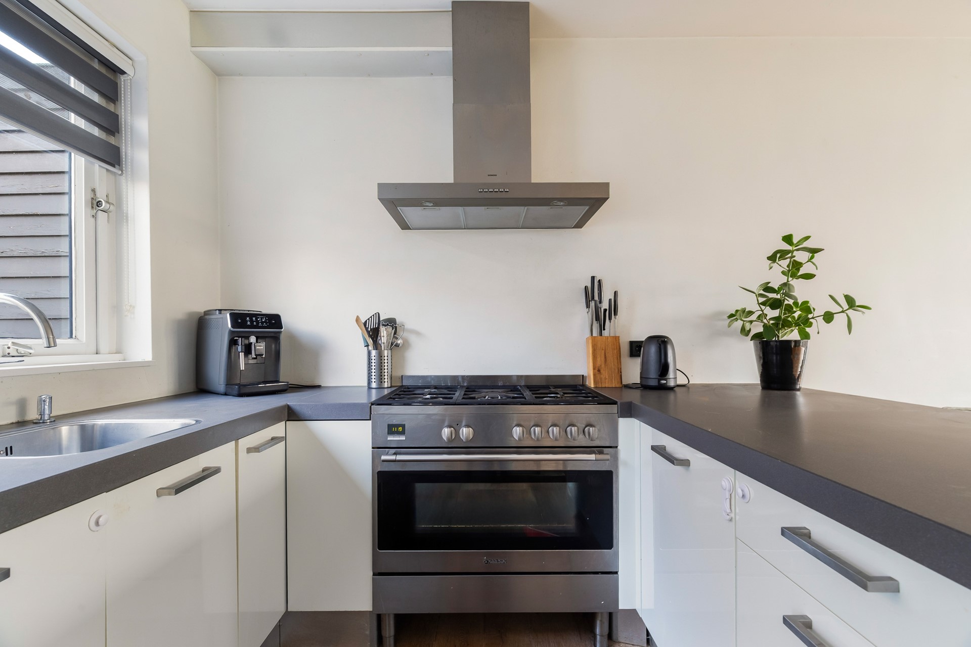 Moderne U-vormige open keuken van het kwaliteitsmerk Bruynzeel, uitgerust met diverse inbouwapparatuur zoals een vaatwasser, kookfornuis met oven en afzuiging. Boven het schiereiland zijn inbouwspotjes geplaatst. Vanuit de keuken is er toegang tot het separate toilet en de achtertuin met berging, welke is voorzien van elektra.