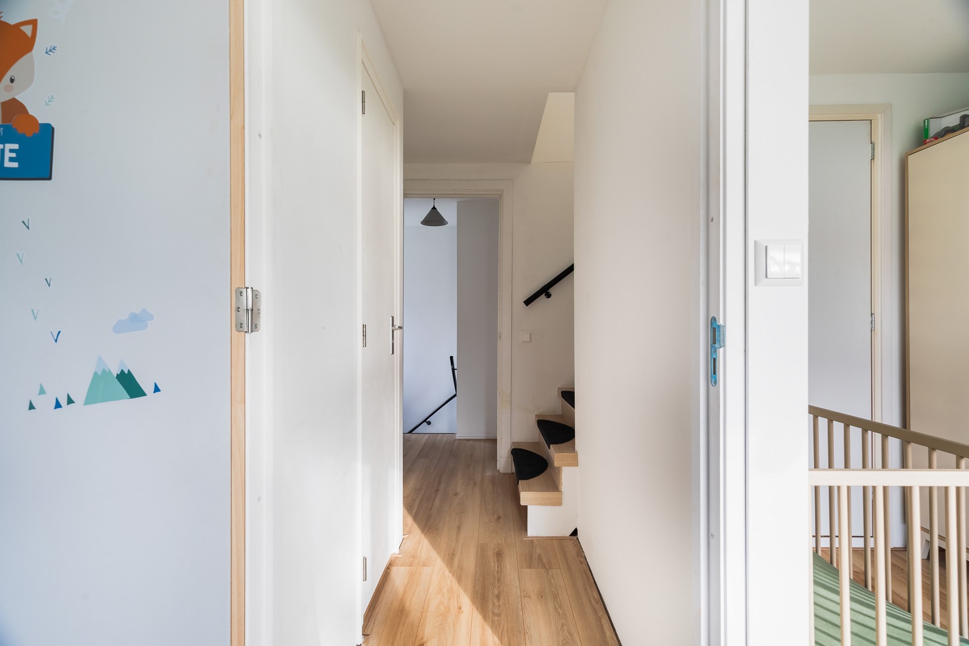 Overloop met toegang tot het toilet en een slaapkamer aan de voorzijde. De verdieping is afgewerkt met laminaatvloeren en strak gestuukte wanden. Via een tussenhal bereikt u de badkamer en de tweede ruime slaapkamer.