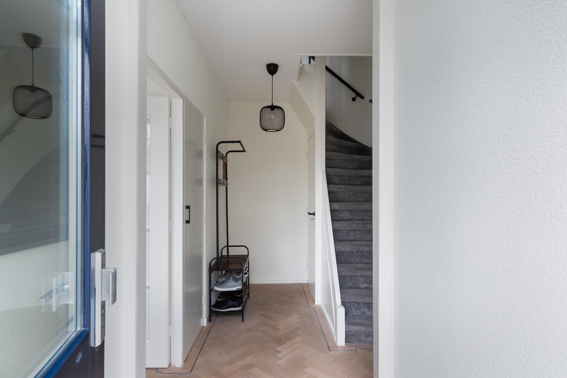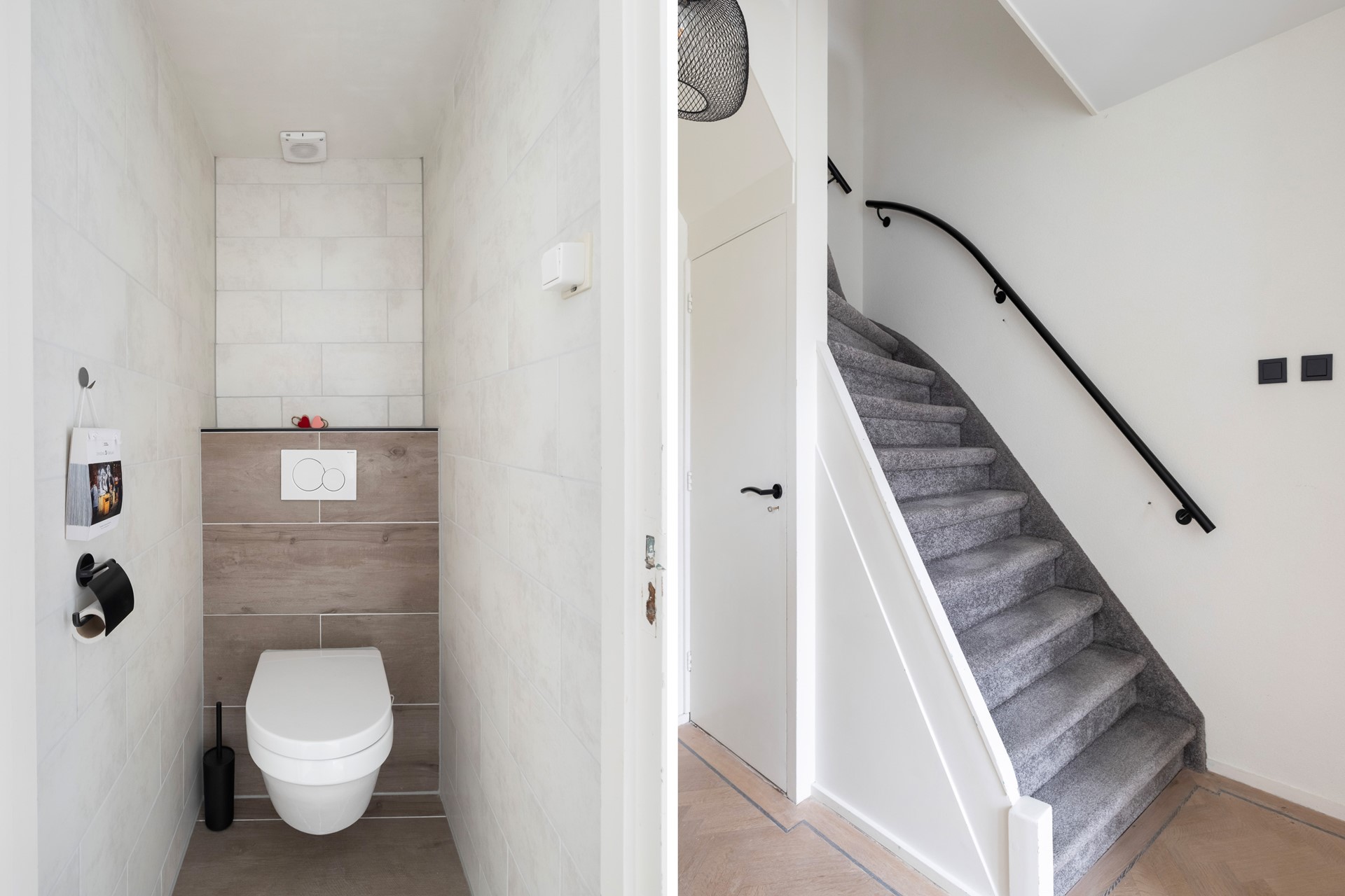 Entree van de woning met hal, meterkast voorzien van vier groepen en slimme meters, een toilet met mechanische ventilatie en toegang tot de keuken. Vanuit de hal is tevens de trap naar de op de begane grond gelegen garage bereikbaar, evenals de trapopgang naar de slaapverdieping.