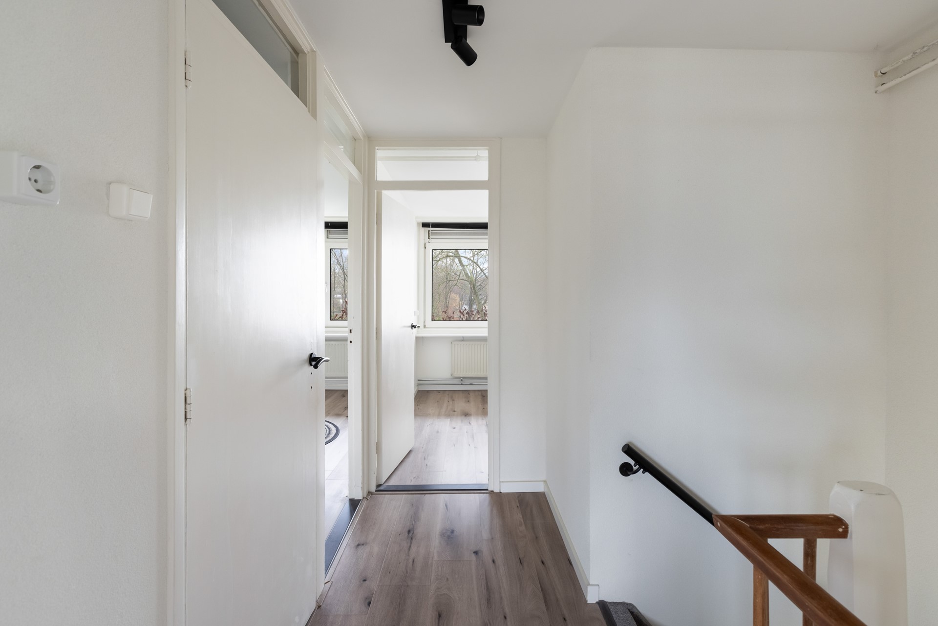 Overloop met toegang tot drie slaapkamers en de badkamer. De vloer op deze verdieping is afgewerkt met laminaat en de wanden zijn deels voorzien van spachtelputz.