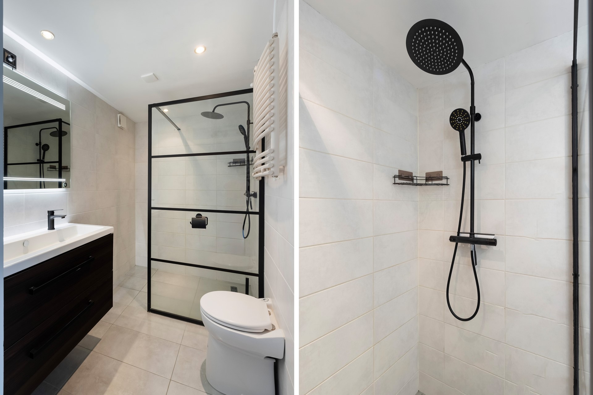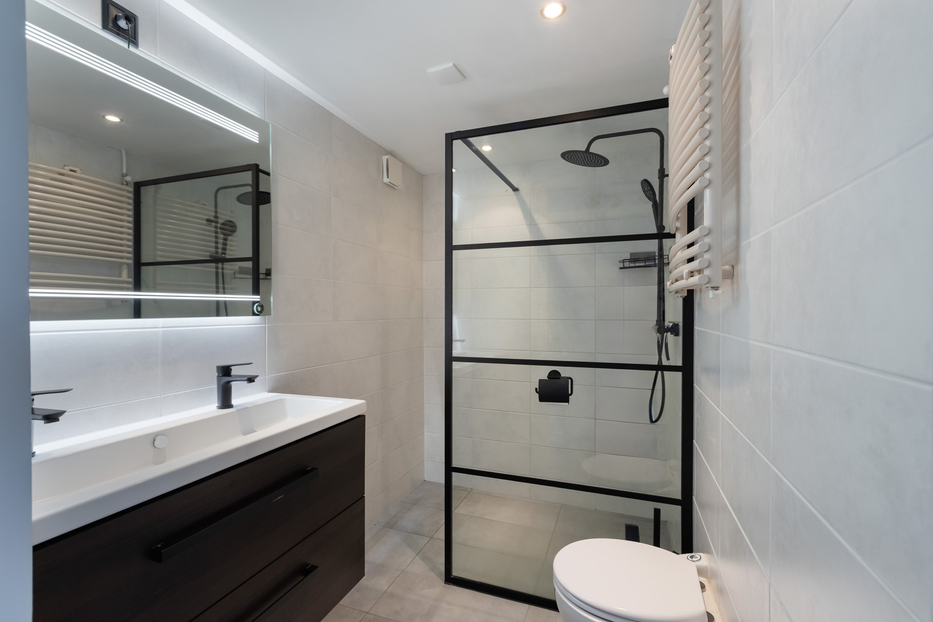 De badkamer is volledig betegeld en voorzien van een inloopdouche, wastafelmeubel, toilet en designradiator. Daarnaast beschikt de badkamer over mechanische ventilatie en een sanibroyeur.